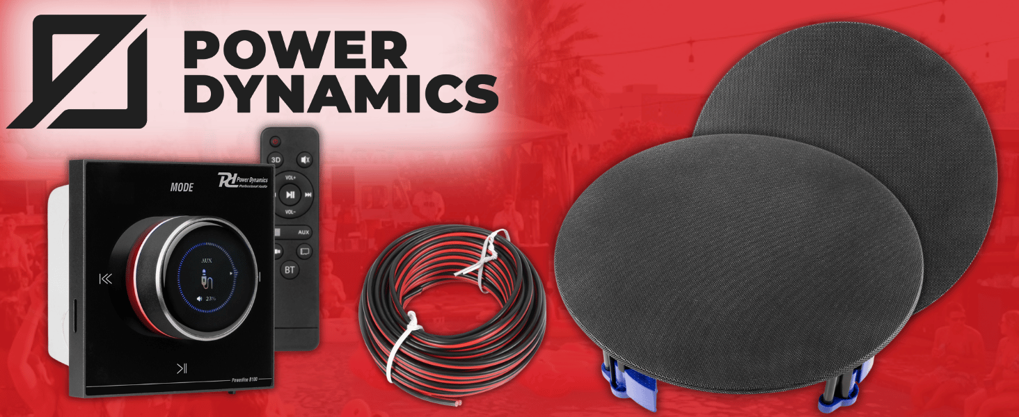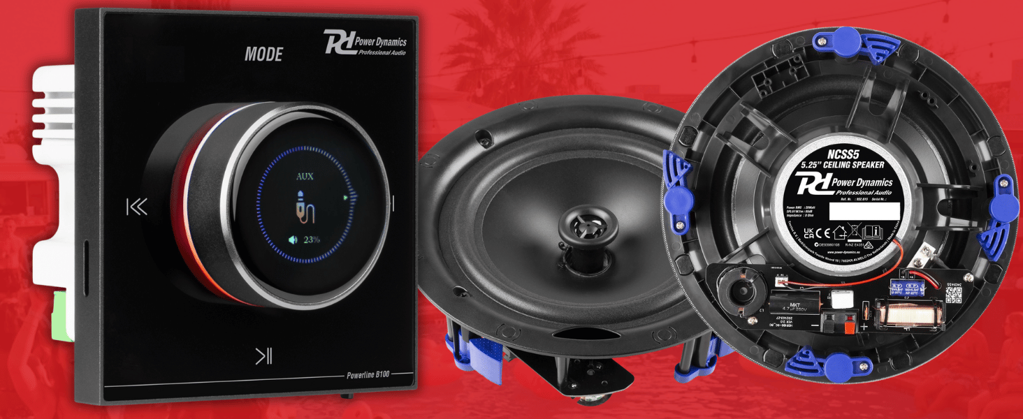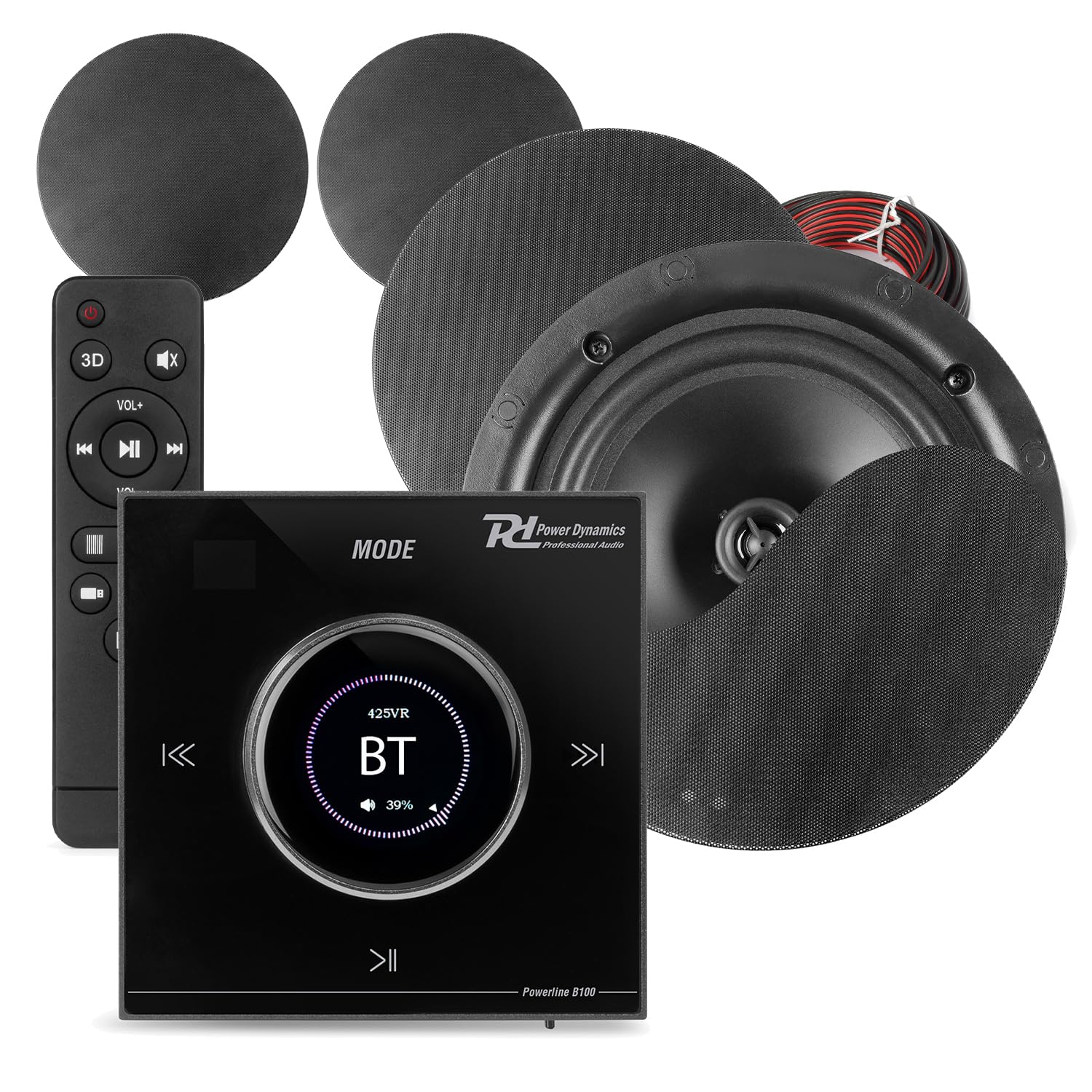 Power Dynamics Powerline B100B Bluetooth Ceiling Speaker System with 4x 5.25 NCSS5B Black Speakers, In-Wall LCD Amplifier, 10m Speaker Cable – Wireless Home Audio Kit for Multiroom & Kitchens