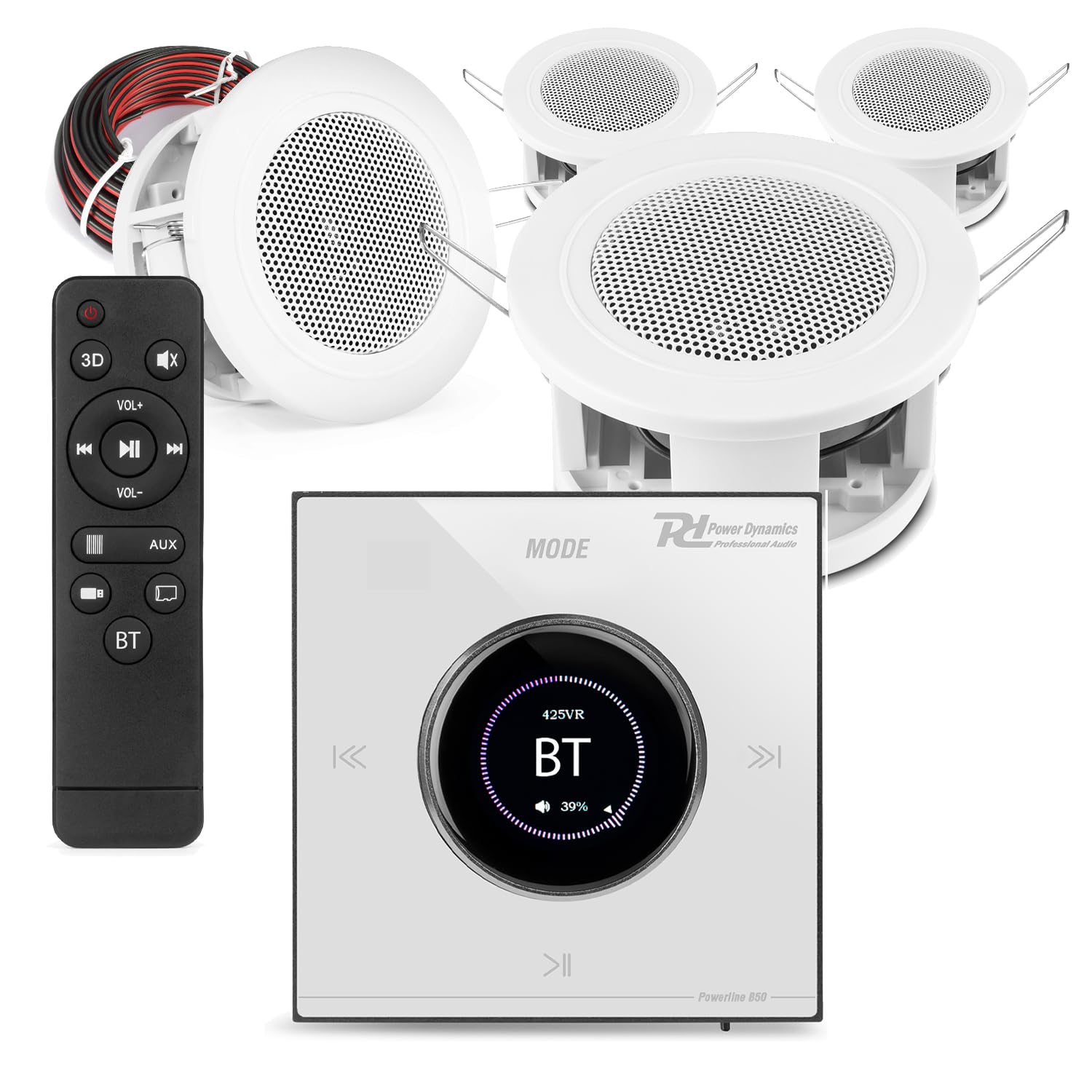 Powerline B50W Bluetooth Compact Ceiling Speaker System – Complete 4-Zone Audio Solution with In-Wall LCD Amplifier, 4x 3″ Low-Profile Ceiling Speakers, Speaker Cable Included, Home or Office