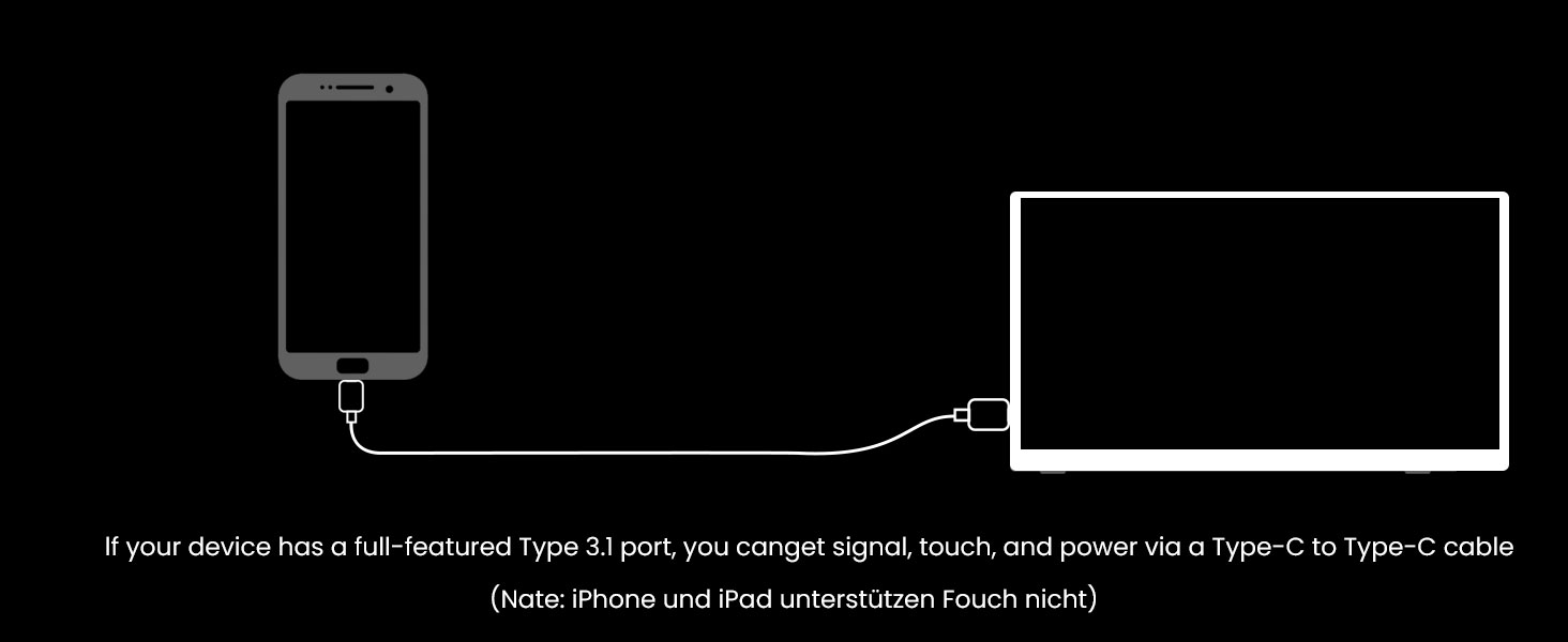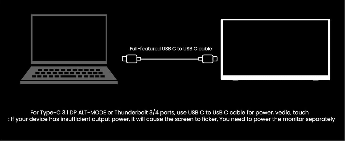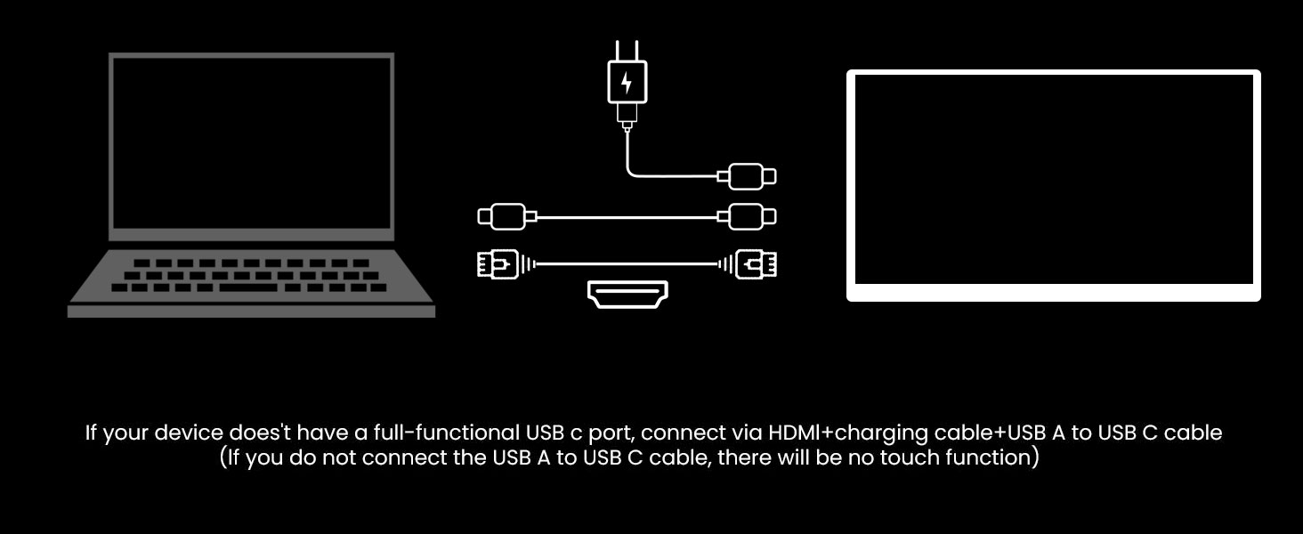- Multiple Connectivity Options (USB-C & HDMI):portable touch monitor supports both USB-C and HDMI connections, allowing easy and quick setup with a variety of devices. Whether it’s a laptop, smartphone, tablet, or even a gaming console, connecting is seamless and hassle-free. USB-C: Simply plug in a USB-C cable for both power and video transmission. This makes it easier to set up, reducing cable clutter and ensuring fast data transfer and efficient power delivery. HDMI: For devices with only HDMI ports, make sure to connect to a power source and use a USB-C to USB-A cable to activate touch functionality. Make sure all connections are correctly made to enable full functionality.