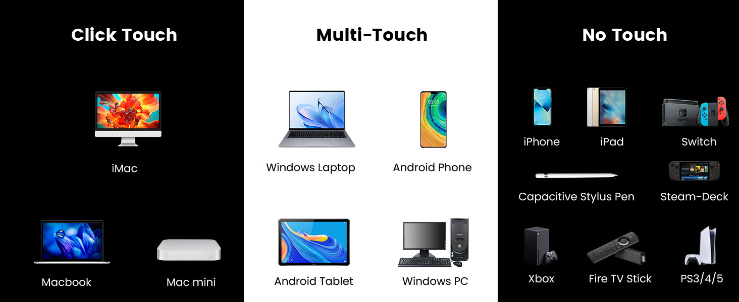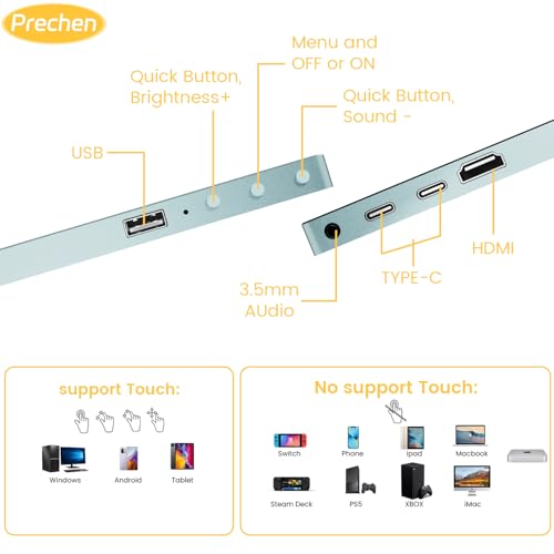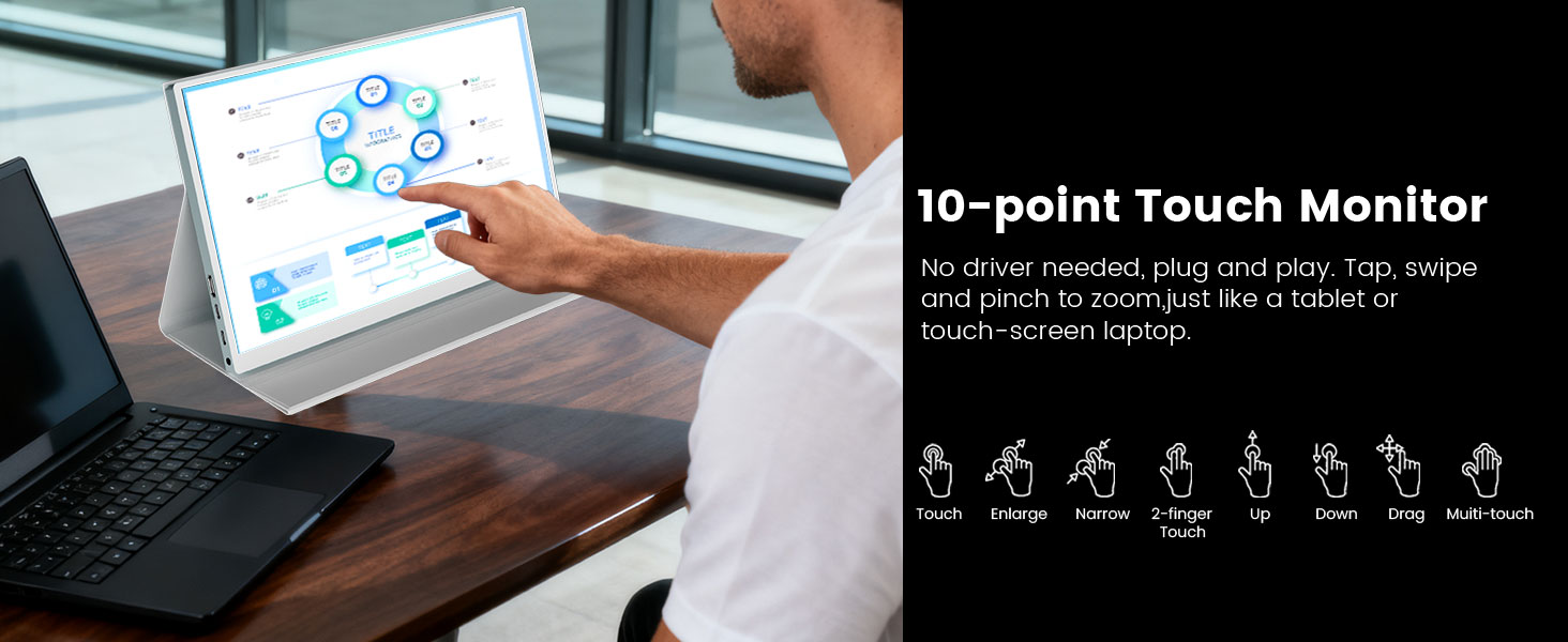 - 10 Point Multi Touch Support:This monitor features 10-point multi-touch technology, allowing you to interact with the screen in a precise and responsive manner. It is perfect for multitasking, interactive applications, and creative tasks, providing a smooth and intuitive touch experience. The high-touch accuracy makes it ideal for tasks like drawing, design, or even interactive presentations. Note: Apple devices (iPhones and iPads) only support 2-point touch and are not compatible with 10-point touch. Additionally, game consoles (such as Xbox, Switch, PS5/PS4) do not support any touch functionality, meaning the screen can only be used for visual output, not interaction.
