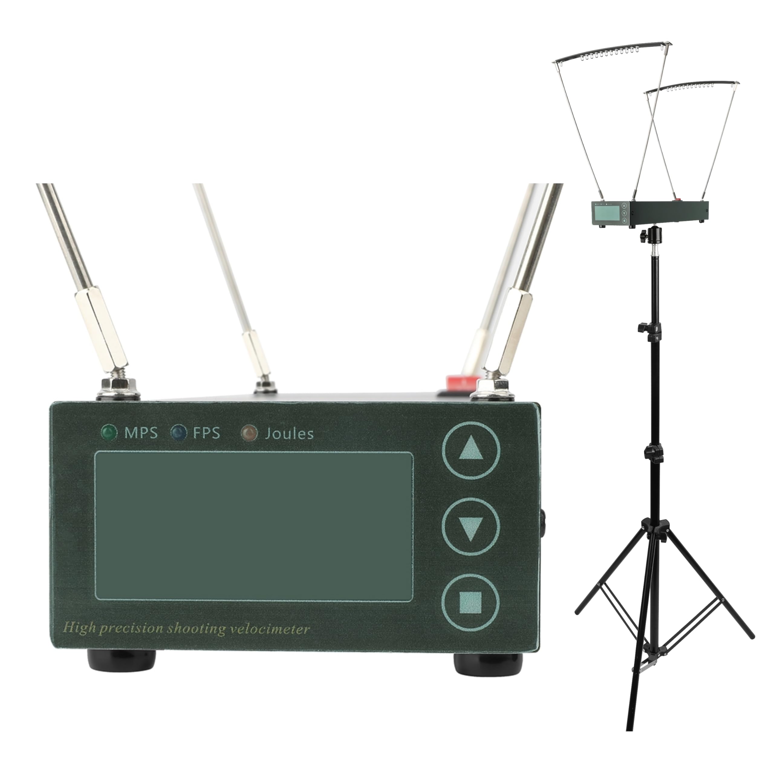 Material: aluminum alloy Voltage: DC 6V Battery (not included): 4 * AA battery Working Temperature: -30℃ – 60℃ Accuracy: test error ≤1% Range of velocity measurement: 1-2000 M/S, (4-6500 FPS) Range of energy measurement: 0.1-6000 J Item Size: 33.5 * 21.8 * 29.2cm / 13.1* 8.58 * 11.49in Item Weight: 578g / 1.27lbs Product Features: The Digital Chronograph measure the velocity of almost anything that shoots with a large shooting area. Accurate velocity measurement for rifles, pistols, arrows and shotguns. Sensing design that is compatible with a wide variety of loads and light conditions. Easy to set-up and use with a HUGE shooting area. Review through each velocity and shot data. Store 36 shot strings. Delete an individual shot or entire string with the touch of a button.