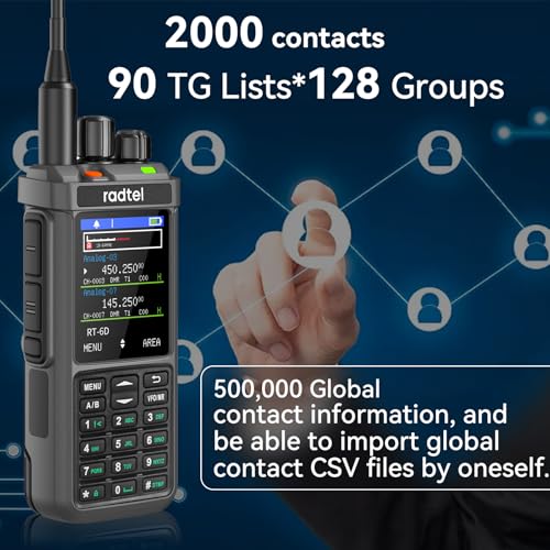 - Data Capacity: Store 2,000 contacts and manage 90 Talk Group lists (each supporting up to 128 groups). Access a built-in global database of 500,000 contacts, with the ability to import your own custom lists via CSV files