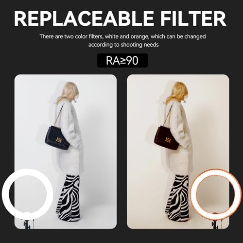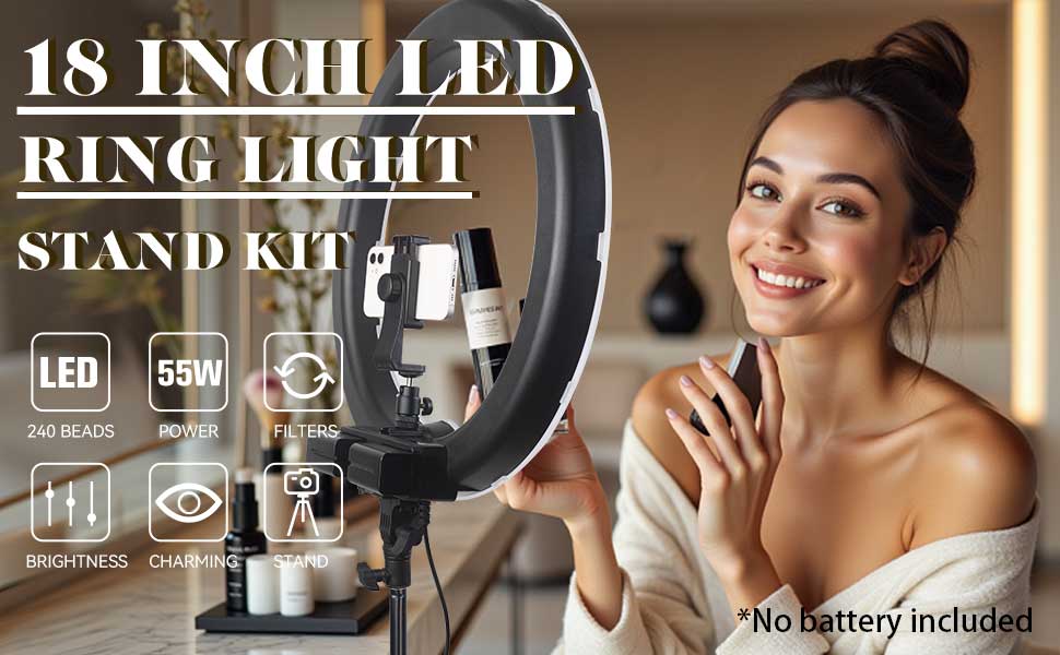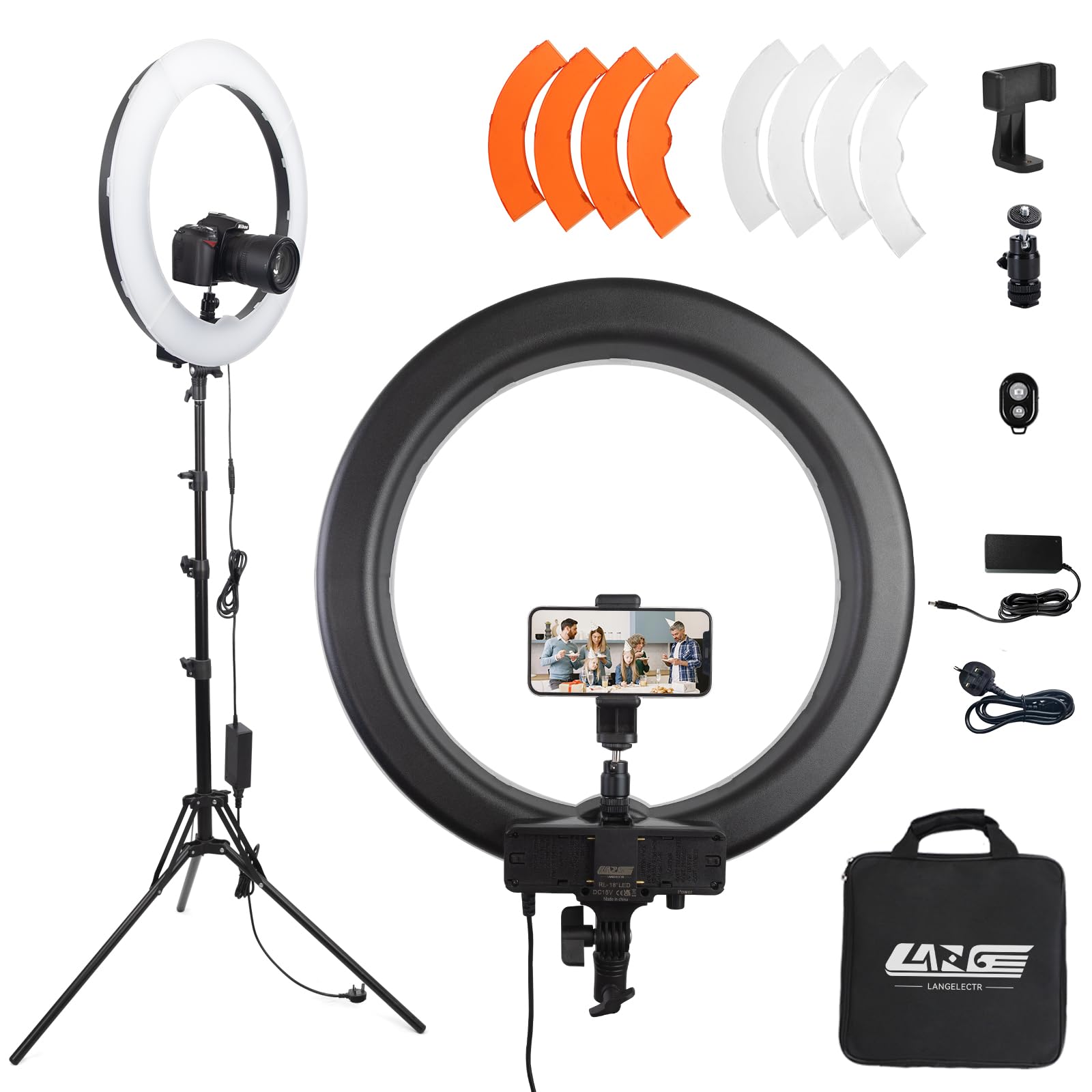 Kit includes :(1)18 "/45 cm 55W 5500K LED ring light +(2)70"/180cm light stand +(3) White and orange 8 filters +(4) ball head hot boots +(5) Universal pwith plug +(6) Phone Holder +(7) Carrying bagower adapter and power cord+(8)Carrying Bag for Ring Light