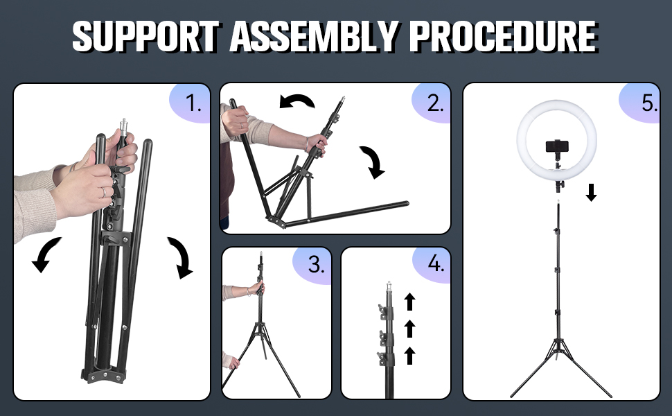 The 70-inch / 180cm ring lamp stand is made of metal and features a three-legged design to keep it stable. However, please note that when in use, make sure the overall center of gravity is on one leg of the stand; otherwise, it is prone to toppling over