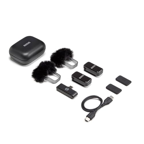 In addition to the two wireless microphones, the set includes additional practical accessories: two miniature fur windbreakers to further improve sound quality in windy conditions, two magnetic attachments for the transmitter modules and a USB-C to USB-C cable for charging the charging case. With these comprehensive features and included accessories, the Rode Wireless Micro is an ideal complete package for anyone who wants to achieve professional sound quality in the easiest way.