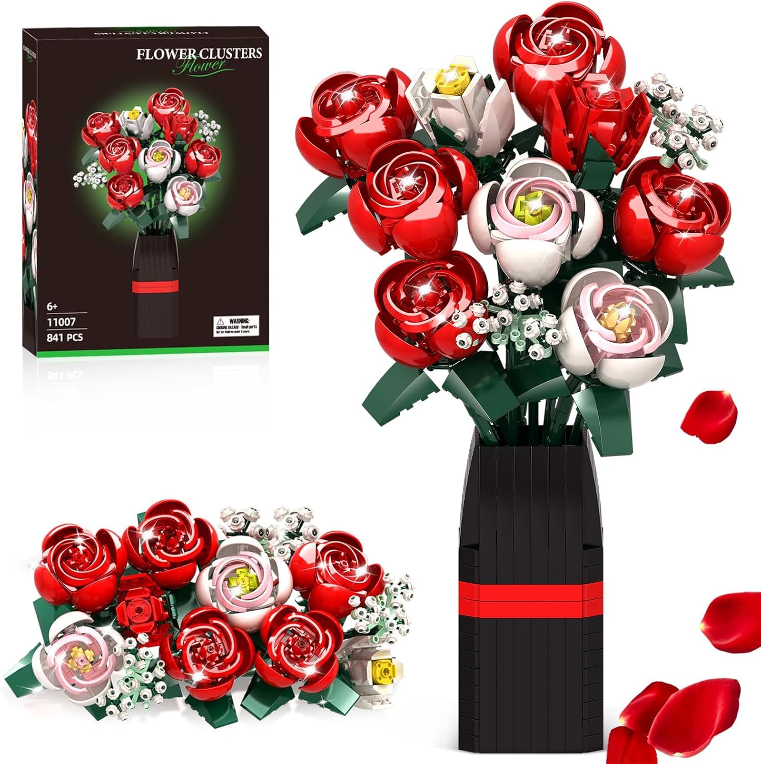 - ROMANTIC ROSE BOUQUET SET: This rose building block set consists of 6 red roses, 3 white roses, 2 gypsophila and an exquisite black vase. There are 841 pieces in total. Every petal and leaf of our Bouquet building set has been meticulously designed to showcase the elegance and beauty of real roses. You do not need to buy a vase separately (Requires Assembly)