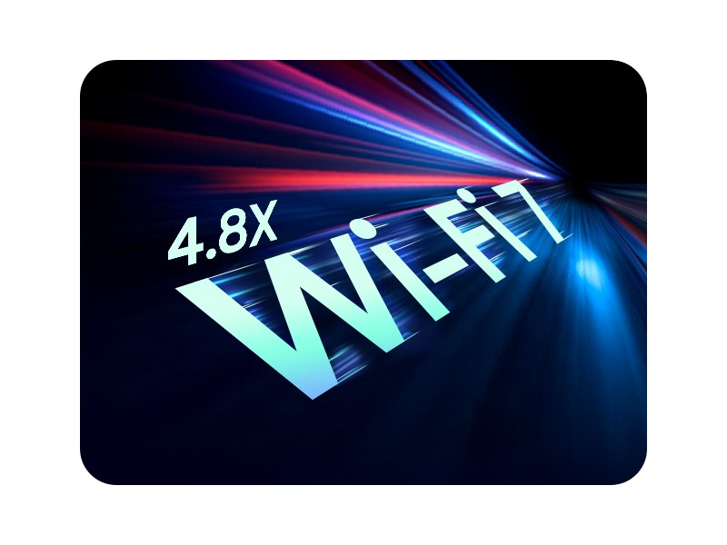 Go online, stay online: Wi-Fi 7 is up to 4.8 times faster than Wi-Fi 6, so you can connect to a network reliably and quickly. Join online meetings, share project updates, and stay connected with others thanks to smooth, real-time interactions and low latency. ²⁸ ²⁹