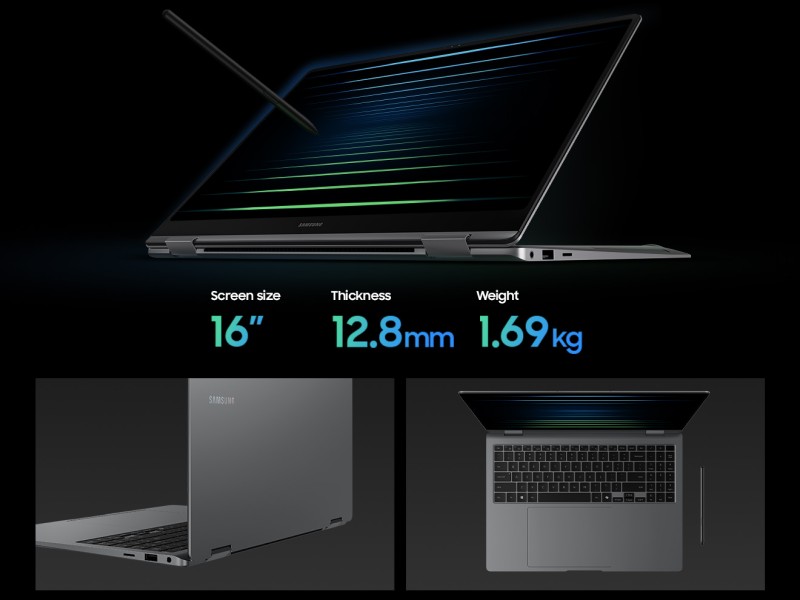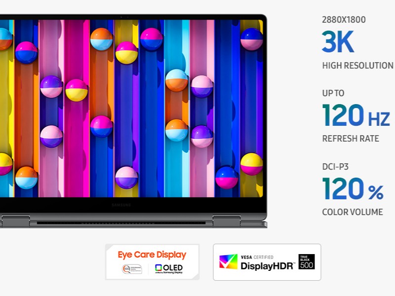 Galaxy Book5 Pro 360 features a 16” 3K(2880×1800) WQXGA+ high-resolution Dynamic AMOLED 2X touchscreen. The display also supports intuitive multi-touch gestures and up to 120Hz refresh rate for a smooth and fluid user experience.⁵ ²³