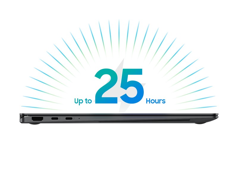 Charge quickly and stay productive all day long with the Galaxy Book5 Pro 360 16's long-lasting battery, which allows for up to 25 hours of video playback. To charge, simply connect the compact charger and fast charge to reach a charge level of up to 35% in just about 30 minutes.