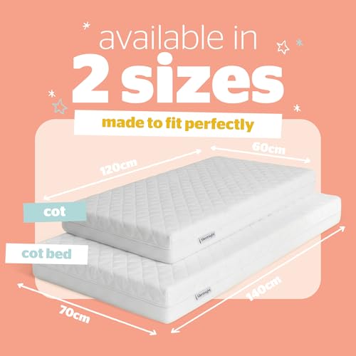 EXTRA DEEP: 10cm deep fibre core. Designed for the perfect fit, Cot Bed Size 70 x 140 x 10cm.