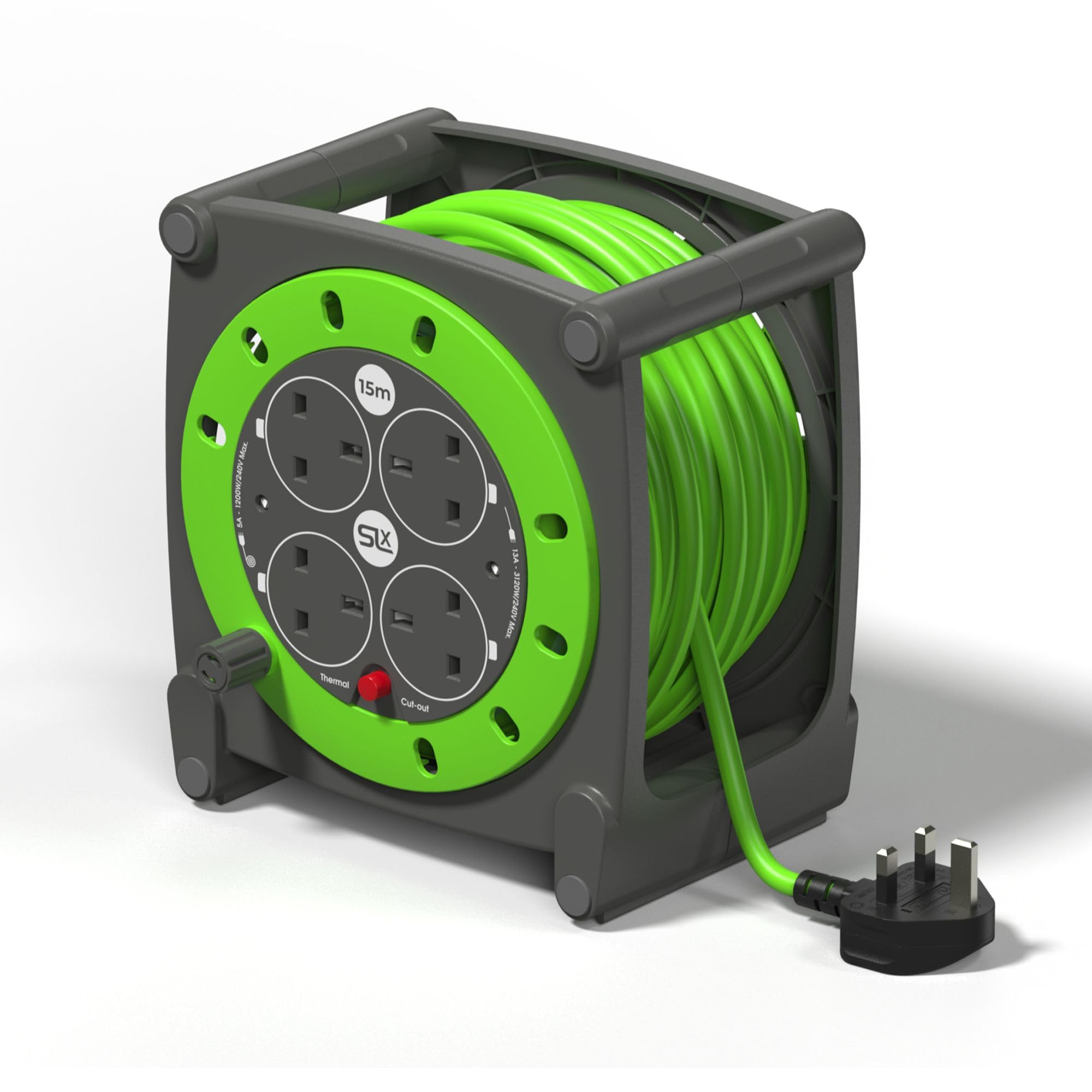 SLx Extension Lead 15m 4 Socket Heavy Duty Cable Reel with Thermal Cut Out, Long Reach Extension Cable for Garden, DIY, Lawn Mower and Workshop, 13A Fused UK Plug in Grey & Gree