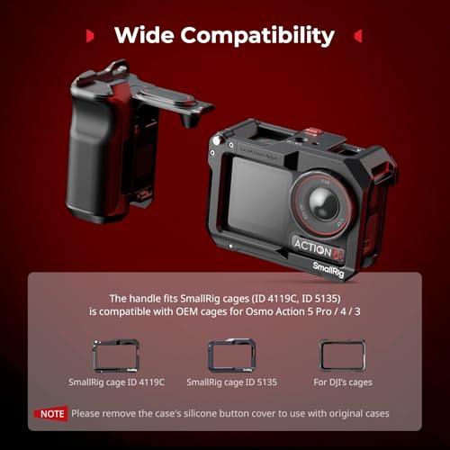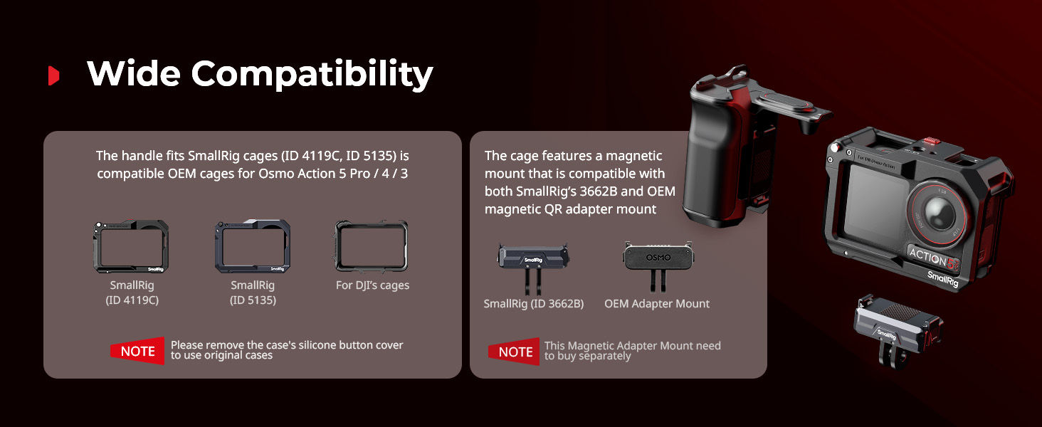- 【For DJI OEM Cages】The handle can for DJI's original Osmo Action 5 Pro/4/3 cage and SmallRig's cages (ID 4119C, 5135). Please note that when using the original cage with the handle, it is necessary to remove the silicone cover of the "shooting button" on the original cage
