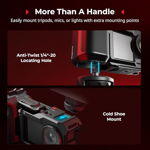 - 【Full Protection】The cage can be used alone or with a handle, suitable for various shooting scenarios. Aluminum alloy cage, with both shock absorption and anti drop performance. The wrist strap provides added safety during street photography, preventing accidental drops