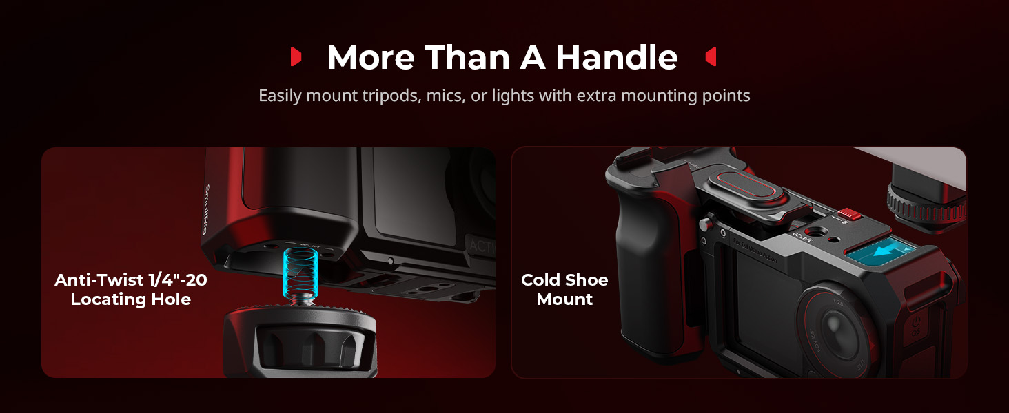 - 【Versatile Extension】The handle's base is equipped with a 1/4"-20 anti-twist locating hole for quick mounting to tripods or extension poles, a cold shoe interface is reserved at the top of the handle, which can be connected to accessories such as fill lights and mics