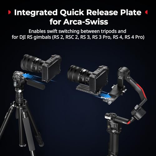 Integrated Quick Release Plate for Arca: The base of the mount plate features a built-in for Arca-Swiss quick release plate, allowing for instant mounting for Arca-Swiss type tripods (ID 5290, 4222B) or for DJI gimbals (RS 2, RSC 2, RS 3, RS 3 Pro, RS 4, RS 4 Pro) for rapid setup transitions.