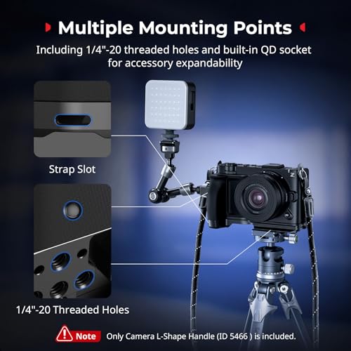 Built-in Multiple Mounting Points: It multiple expansion interfaces, including 1/4"-20 threaded holes and locating holes for attaching magic arms (ID 5308, 4900). A built-in QD socket accommodates QD shoulder straps (ID 4118B), while strap slots enable the attachment of wrist straps (ID 3848) for secure handling or shoulder straps (ID 4882, 5208) for easy carrying. Additionally, a 1/4"-20 threaded hole at the handle allows for switching to portrait orientation.