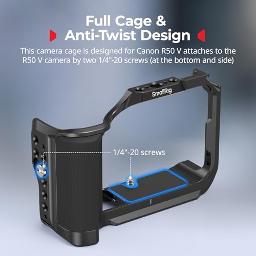 - Integrated Full Cage: This camera cage is specifically designed for the Canon R50 V, offering robust protection, versatile expansion, and optimized grip. Its full-cover construction protects the camera, and it attaches to the R50 V camera by two 1/4"-20 screws (at the bottom and side) for secure locking without deflection, while integrated internal silicone pads prevent scratches.