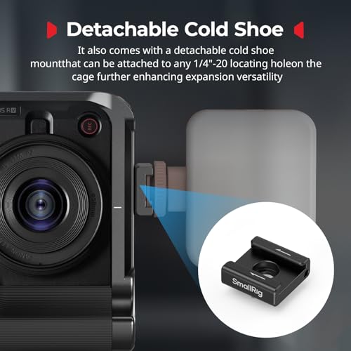 - Vertical Shooting & Detachable Cold Shoe: This cage for Canon R50V features a 1/4"-20 threaded hole on the handle's side for attaching an additional grip in portrait orientation.It also comes with a detachable cold shoe mount that can be attached to any 1/4"-20 locating hole on the cage, further enhancing expansion versatility.