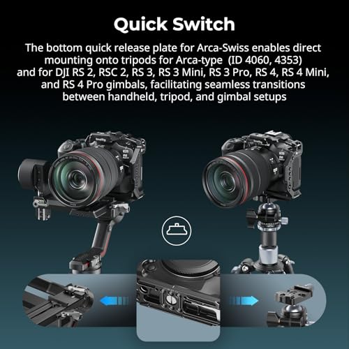 - Quick Switch: The R6 Mark III cage bulit in quick release plate for Arca-Swiss, enables direct mounting onto tripods for Arca-type (ID 4060, 4353) and for DJI RS 2, RSC 2, RS 3, RS 3 Mini, RS 3 Pro, RS 4, RS 4 Mini, and RS 4 Pro gimbals, facilitating seamless transitions between handheld, tripod, and gimbal setups