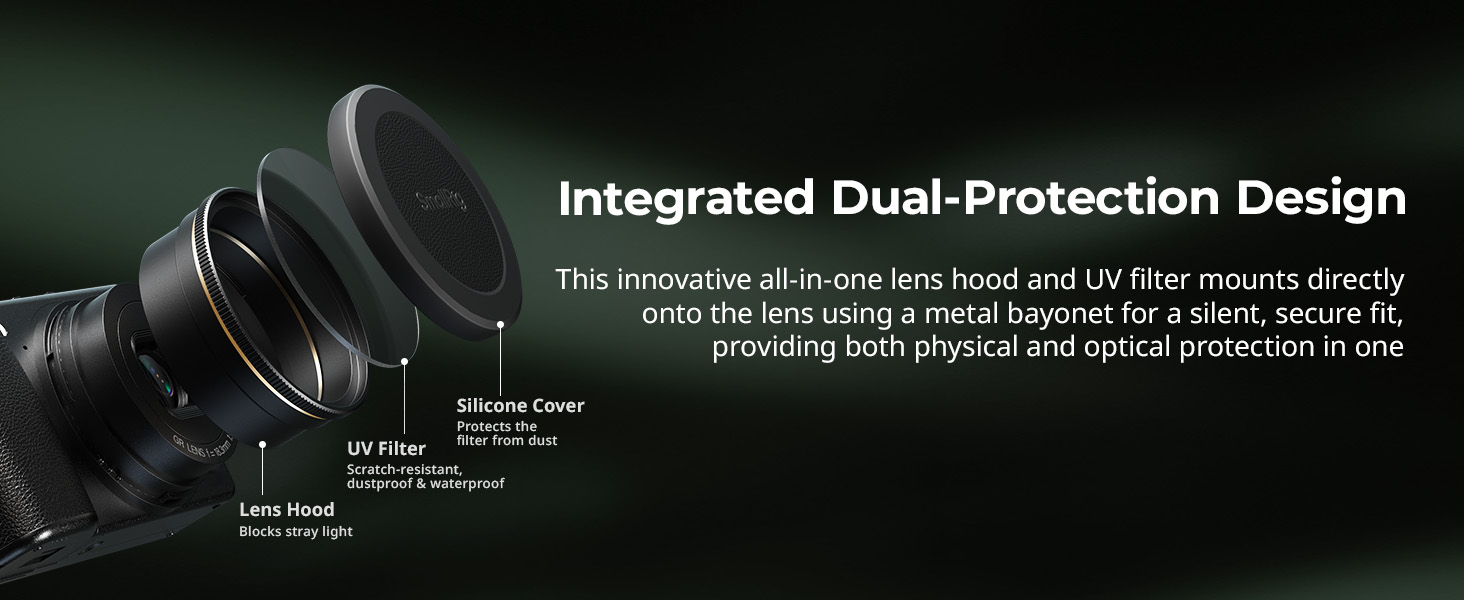 - Integrated Dual-Protection Design: This innovative all-in-one lens hood and UV filter mounts directly onto the lens using a metal bayonet for a silent, secure fit, providing both physical and optical protection in one. Its compact profile does not obstruct the viewfinder or built-in flash