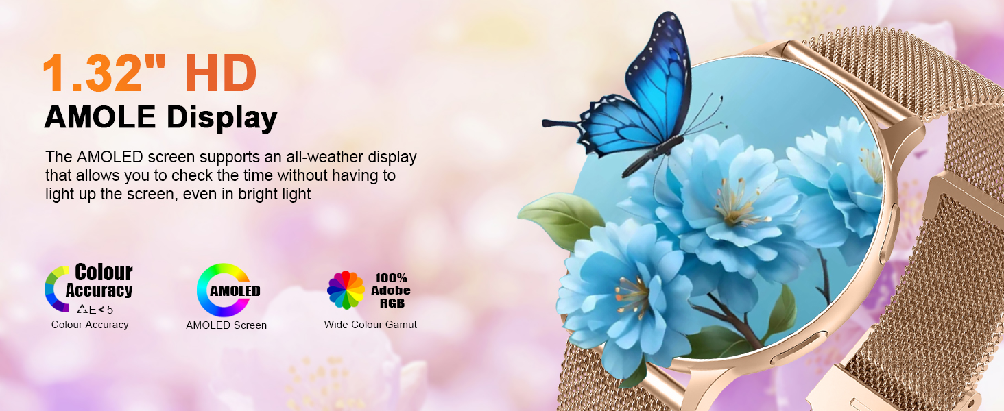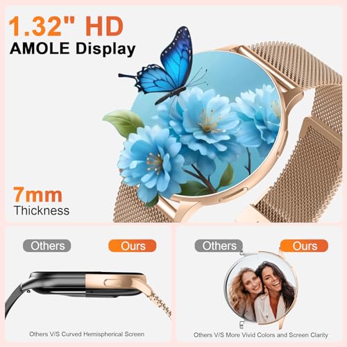 - Elegant Design for Every Occasion:This smart watch for women boasts a slim 7mm body and a stylish gold Milanese strap, making it the perfect accessory for any outfit, from casual to professional. The 1.32-inch AMOLED screen offers crisp visuals with vibrant colours, making it easy to read even in bright sunlight. With 100+ customizable watch faces, this fitness watch lets you personalize your look to match your unique style, all while offering high-end functionality.