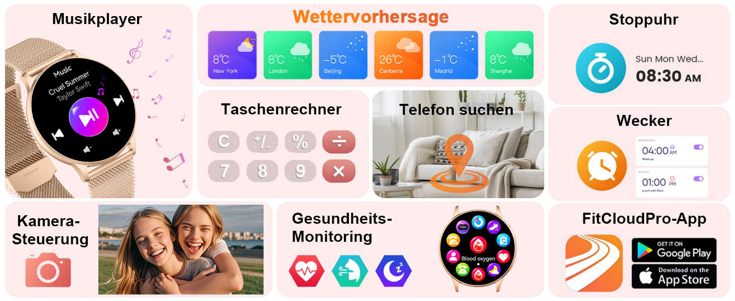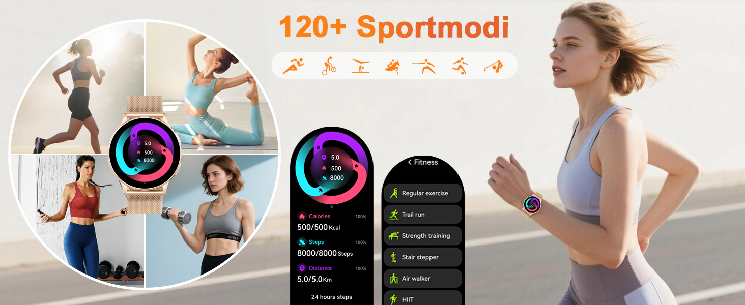- 120+ Sports Modes to Track Every Workout:From running and cycling to yoga and HIIT, this smart watch for women supports over 120 sports modes to track every aspect of your fitness. It accurately records steps, calories burned, and distance traveled, and syncs with your phone’s GPS to track outdoor routes. With easy access to your workout data through the FitCloudPro app, this fitness watch helps you stay motivated and reach your fitness goals, whether at the gym or outdoors.