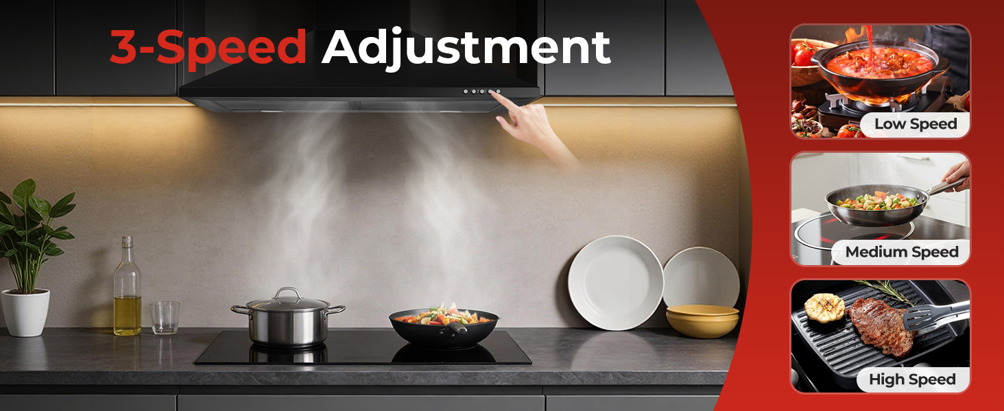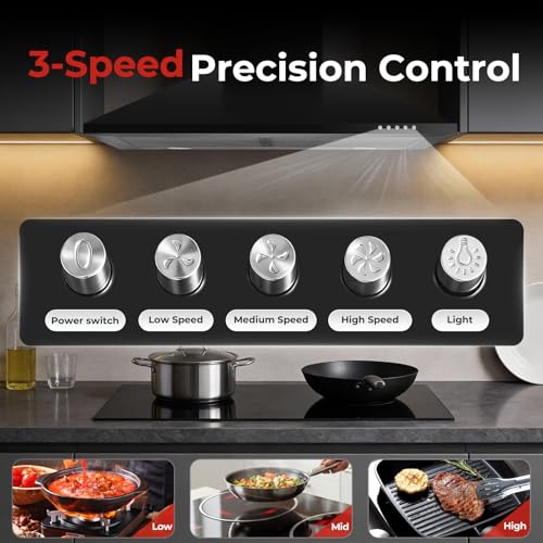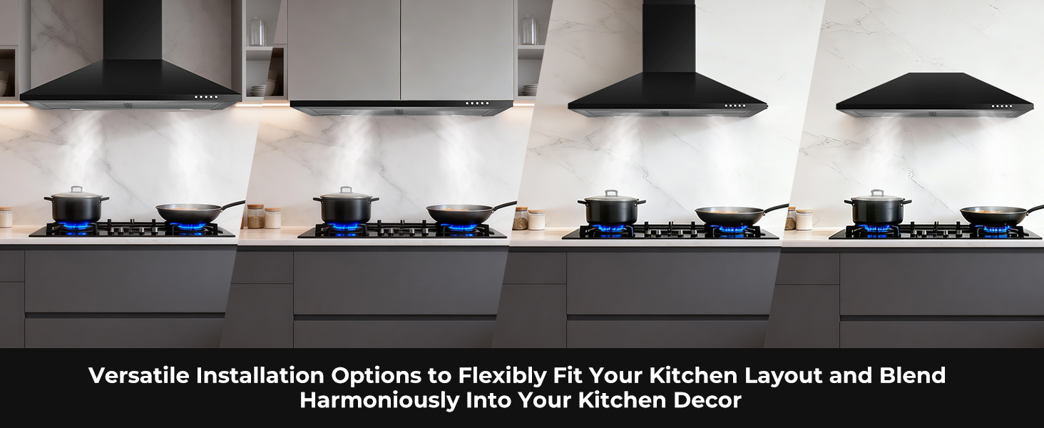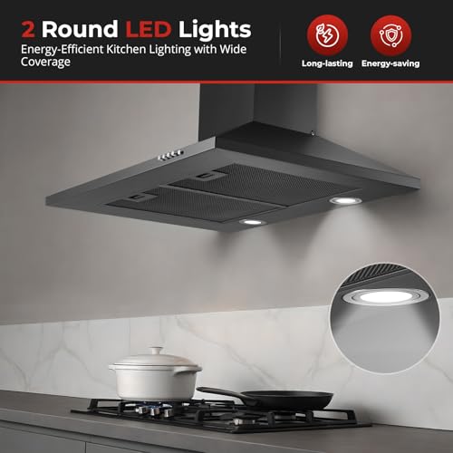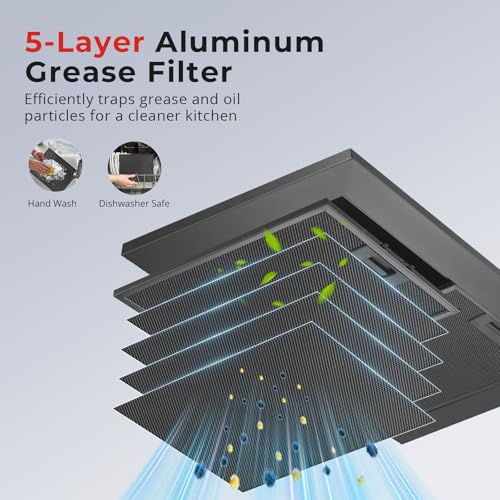 - Easy to Clean: Crafted from premium matte black material, this sleek extractor hood resists fingerprints, corrosion, and stains. Its smooth surface wipes clean in seconds, and the included dishwasher-safe 5-layer aluminum grease filters trap oil efficiently for long-lasting, easy maintenance.