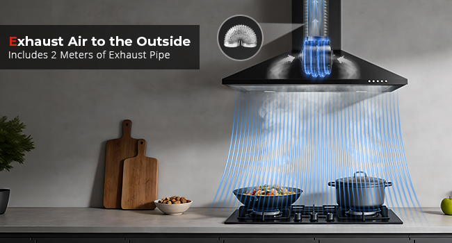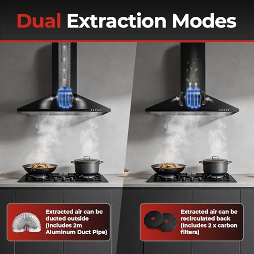 - Dual Ventilation Modes Included: Enjoy ultimate flexibility with two ready-to-use installation options. Set up as a ducted kitchen extractor hood using the included 2-meter aluminum exhaust pipe to vent outside, or use the provided activated carbon filters (Model: YYCF-55E) for efficient recirculation mode, purifying and returning air back into the kitchen.