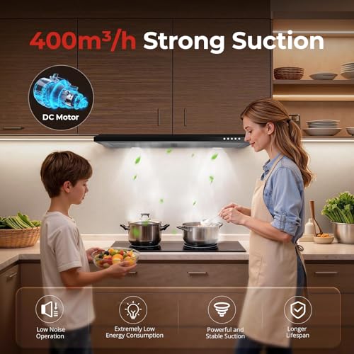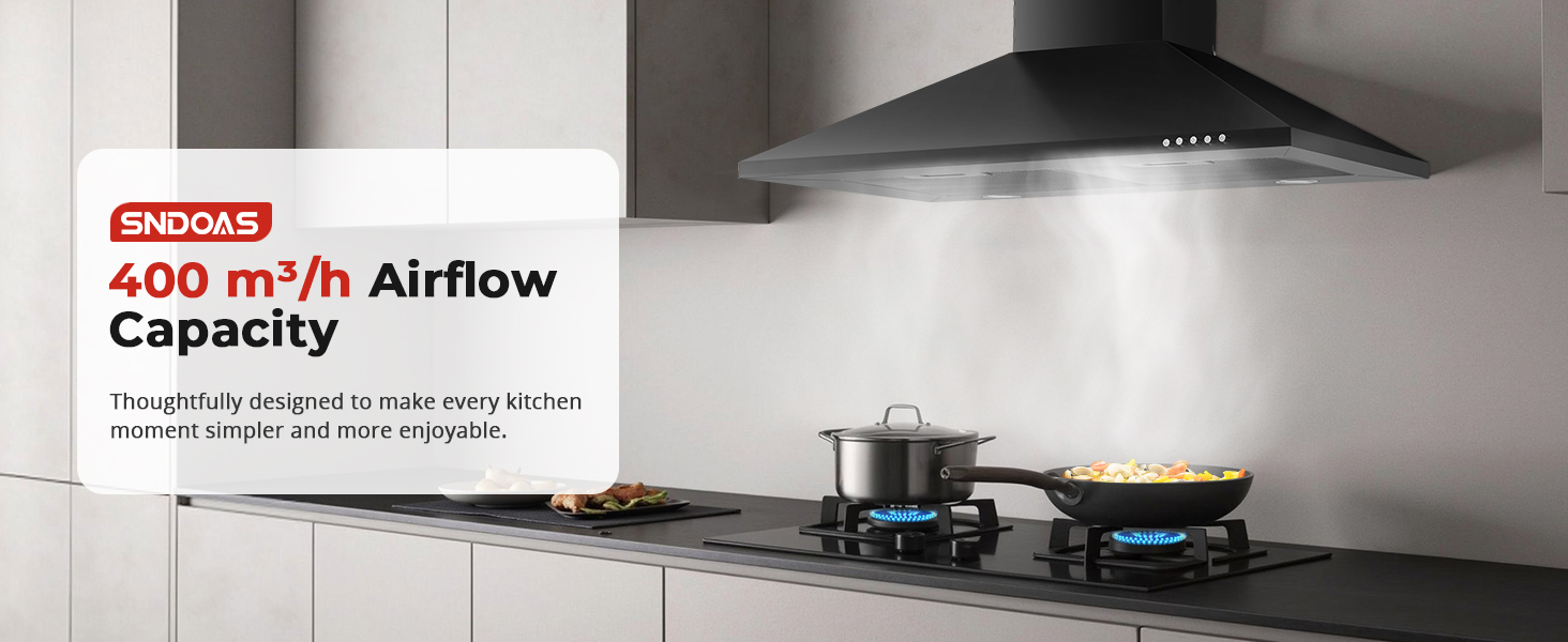- High Performance: The SNDOAS 60cm cooker Hood is powered by an A+++ rated DC motor that delivers 400 m³/h strong airflow to effectively clear kitchen smoke, grease, and odors. It is operated through intuitive mechanical buttons with 3 speed options, while its optimized design ensures quiet performance for a comfortable cooking environment.
