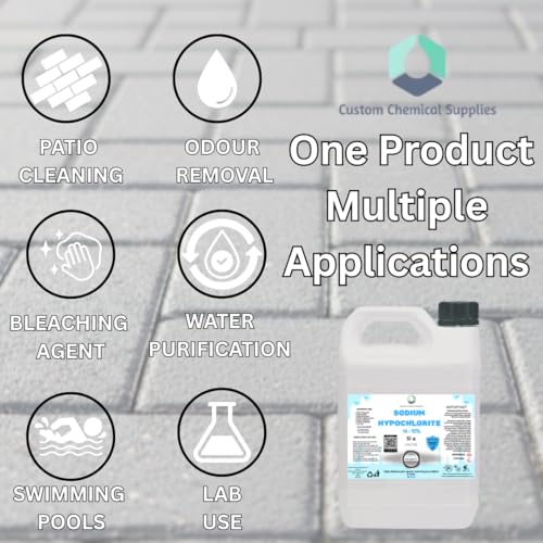 Customchem Sodium Hypochlorite is a powerful multi-purpose cleaning solution with an extra strong 14-15% concentration, making it highly effective for a wide range of applications. This versatile chemical comes in a convenient 10-litre pack (2x5L bottles), perfect for both domestic and commercial use. As a premium patio cleaner, it effortlessly removes stubborn stains, algae, moss, and black spots from outdoor surfaces, restoring them to their original appearance. The solution is also ideal for swimming pool maintenance, serving as a reliable liquid chlorine treatment that keeps pool water crystal clear and hygienically clean. Beyond outdoor cleaning and pool care, this sodium hypochlorite solution functions as an effective bleaching agent, odour remover, and water purification treatment. The high-quality formulation ensures consistent results across various cleaning tasks, from sanitising surfaces to treating water systems. Each 5-litre container features a secure cap and convenient handle for easy pouring and storage. Please follow all storage instructions carefully, wear appropriate protective equipment during use, and consult the product label for detailed directions and safety information before application.