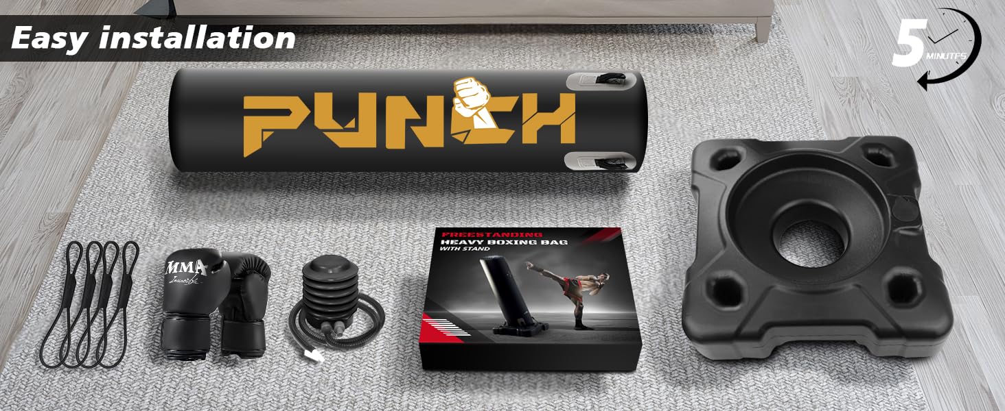 Easy to Use: Simply fill the base of the boxing heavy bag with water or sand or both, then inflate the body parts with the air pump, then you can get a sturdy boxing punching bag with stand.