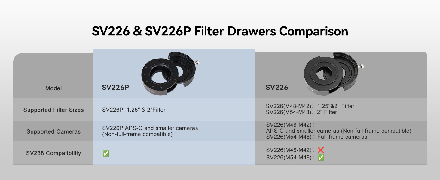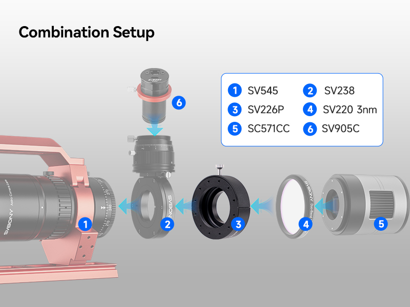 - Streamlined deep-sky imaging setup: combine SV226P filter drawer with the SV545; SV238; SV220 3nm filter; SC571CC main camera; and SV905C guide camera for a clean; efficient workflow;delivering fast captures; stable guiding
