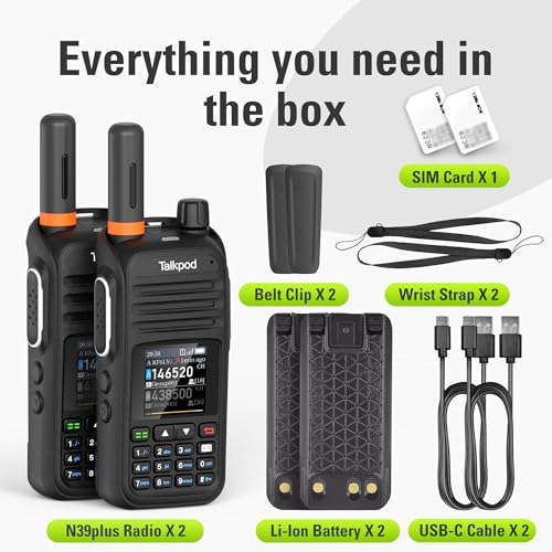 What's in the box: 2 × N39plus Radio, 2 × Antenna, 2 × Lithium-ion Battery, 2 × USB-C Charging Cable, 2 × Belt Clip, 2 × Lanyard