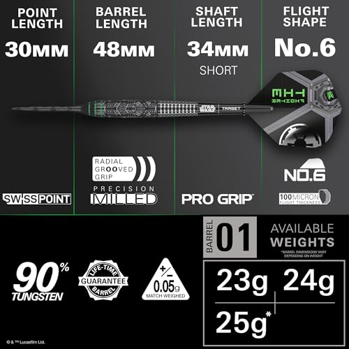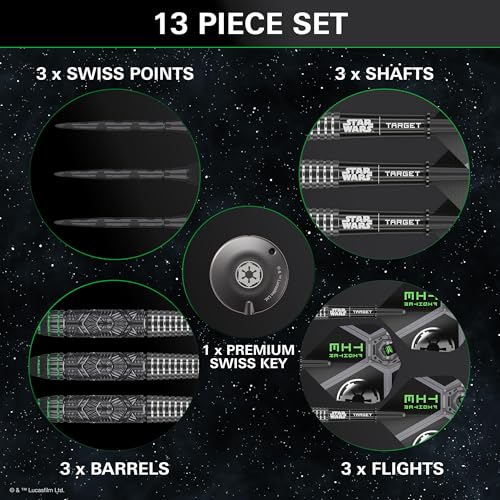 - PACK CONTAINS: 3x STAR WARS | TARGET 90% Tungsten Dart Barrels (23G Dart Barrel Length: 48mm, Diameter: 7mm), 3x Swiss Storm Onyx Points (Black, 30mm), 3x Pro Grip Star Wars Shafts (Short, 34mm), 3x Pro Ultra Tie Fighter No.6 Flights, 1x Premium Swiss Keyring Tool (Official Black), and 1x 1 Month DartCounter App Subscription.