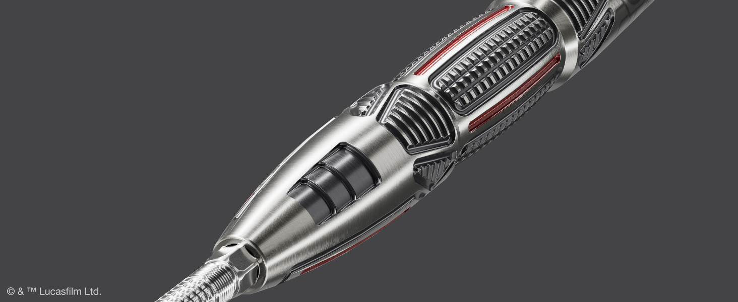 The 90% tungsten barrel mirrors the X-Wing's balanced form with radial grooves for a fluent release