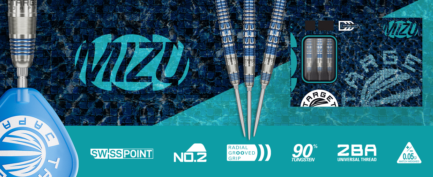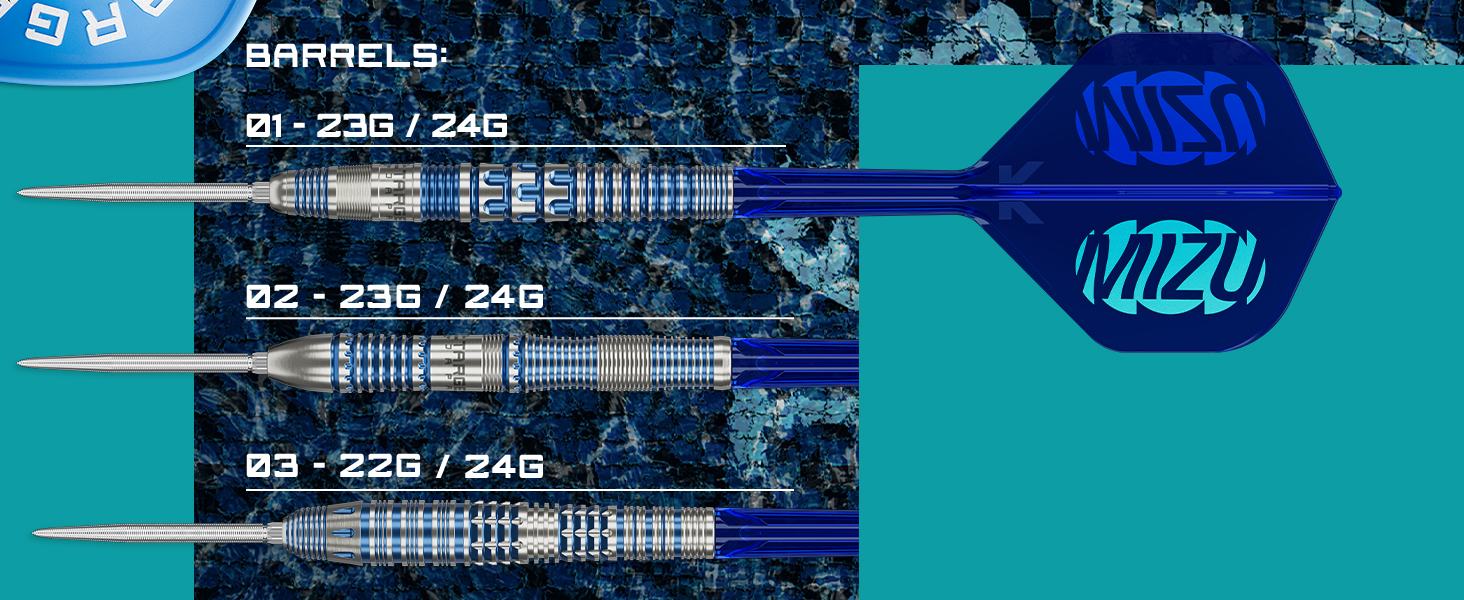 MIZU SERIES 01 STEEL TIP DART SET: The timeless front-tapered barrel promotes smooth, controlled throws, with multiple grip sections featuring varying ring-cut depths and a pixel-cut centre section for balanced traction, precise finger positioning, and enhanced accuracy. Finished with a metallic blue coating that blends Japanese elegance with European sophistication.