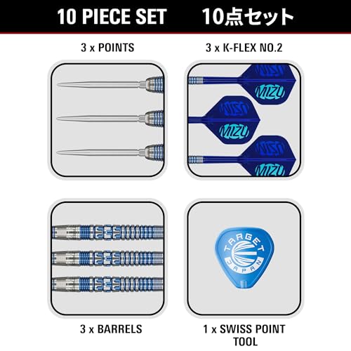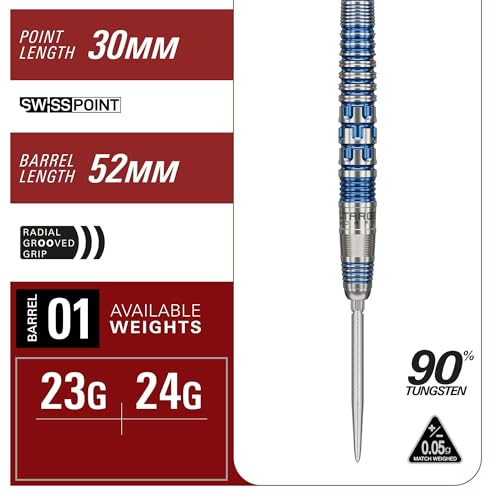PACK CONTAINS: 3x 90% Tungsten Barrels (23G Dart Barrel 01 Length: 52mm, Diameter: 6.7mm), 3x Swiss Storm Nano Points (Silver, 30mm), 3x Blue K-Flex No.2 Flights & Shafts (Intermediate, 26mm), and 1x Blue Swiss Point tool.