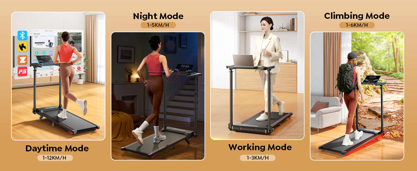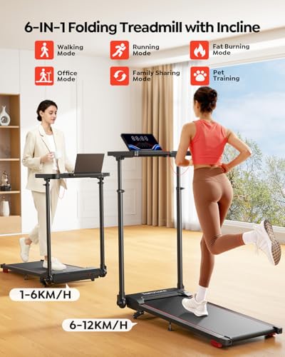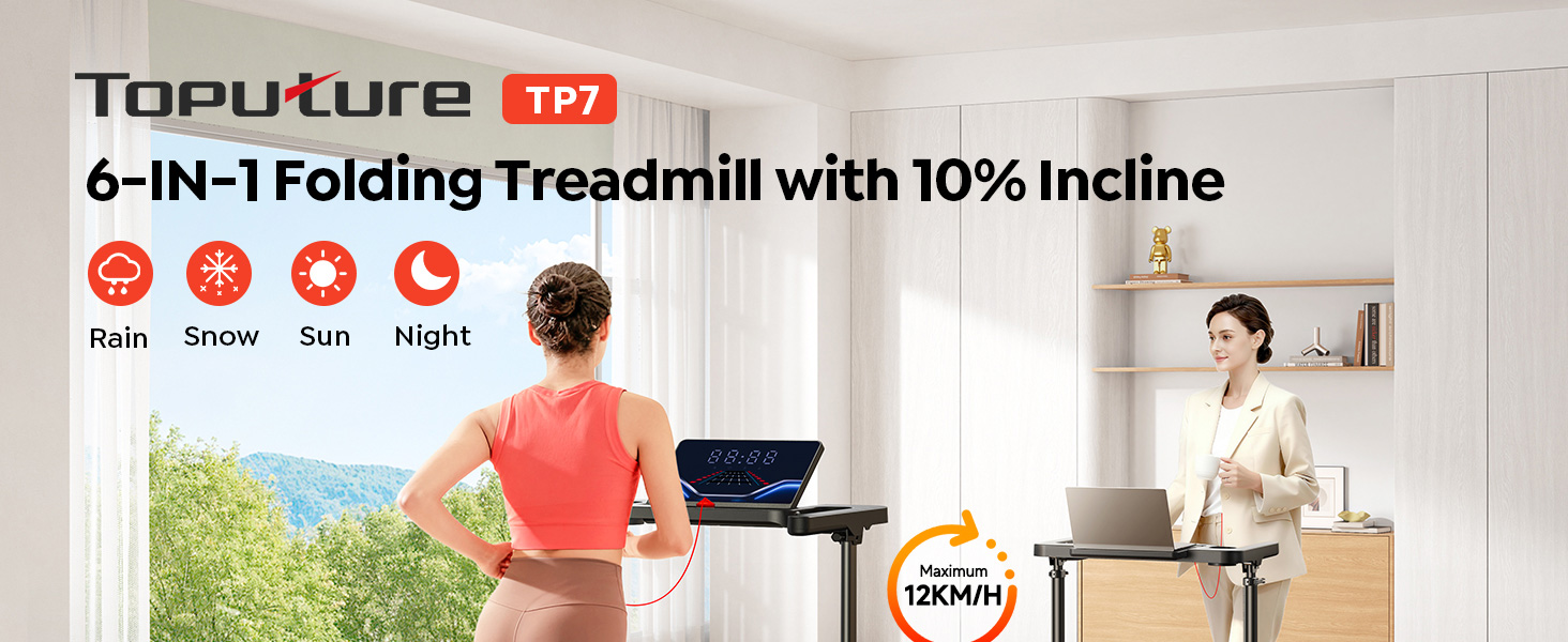 - 【6-in-1 Foldable Treadmill for Home】: TOPUTURE folding treadmill speed range varies from 1 to 12KM/H, suitable for at least six different scenarios, including walking mode, fat-burning mode, office mode, pet training, running mode and rehabilitation mode. Replacing the traditional treadmills and walking pad, it achieves brand new experience, freedom from exercise restrictions, allowing you to continue exercising in rainy days, winter and inclement weather. Perfect for home, office and gym