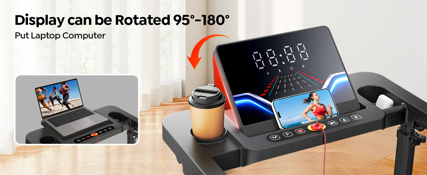 - 【95° & 180°Multifunctional Device Stand】: The upgraded device stand of treadmill features a wider support plate and can rotate 95° or 180°. At 95°, you can place a ipad or phone on it. At 180°, it can be used as a small table to hold a laptop. You can take a walk while working, which is very good for your health.Cup holders and side storage keep essentials close