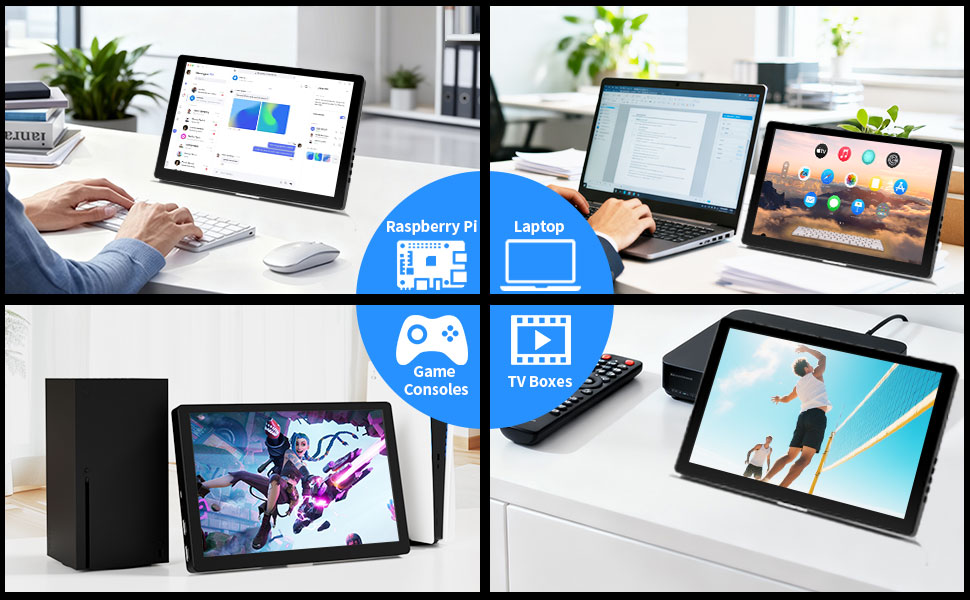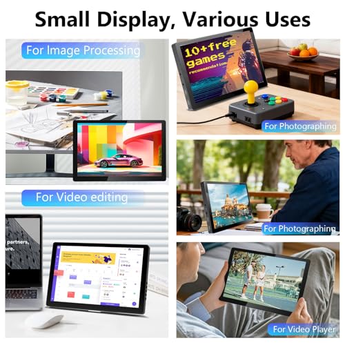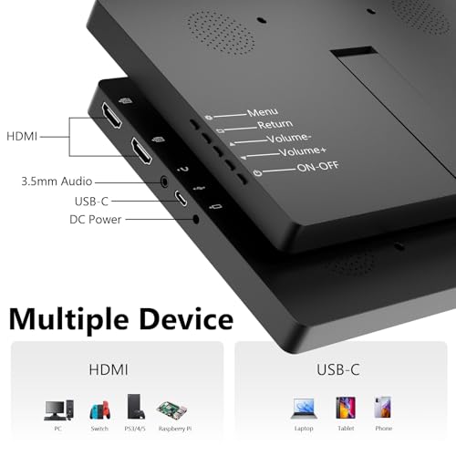 - 【Plug and Play】This 10.1inch mini portable touchscreen display features two HDMI ports, one USB-C port, and a DC 12V power interface, enabling effortless connection to devices such as Raspberry Pi, PCs, Macs, smartphones, laptops, Xbox, Switch, PS4/5, and more. Whether for business travel, on the go, or home entertainment, it perfectly extends your screen or delivers seamless gaming enjoyment.