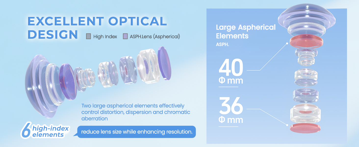 2 large aspherical elements effectively control distortion and ensure edge sharpness. 6 high-index elements reduce lens size while enhancing resolution.