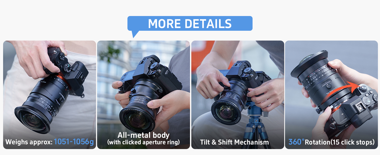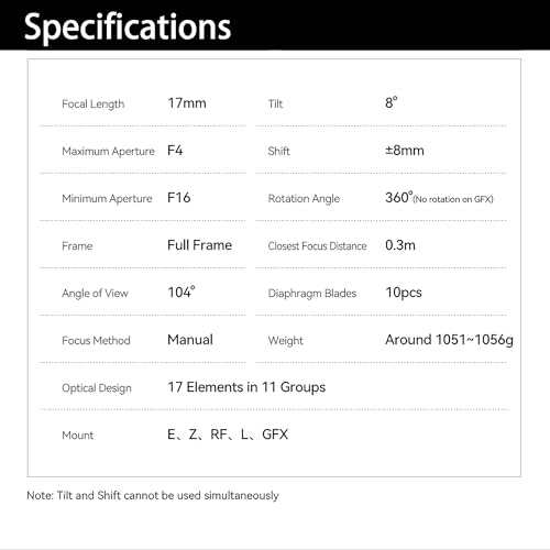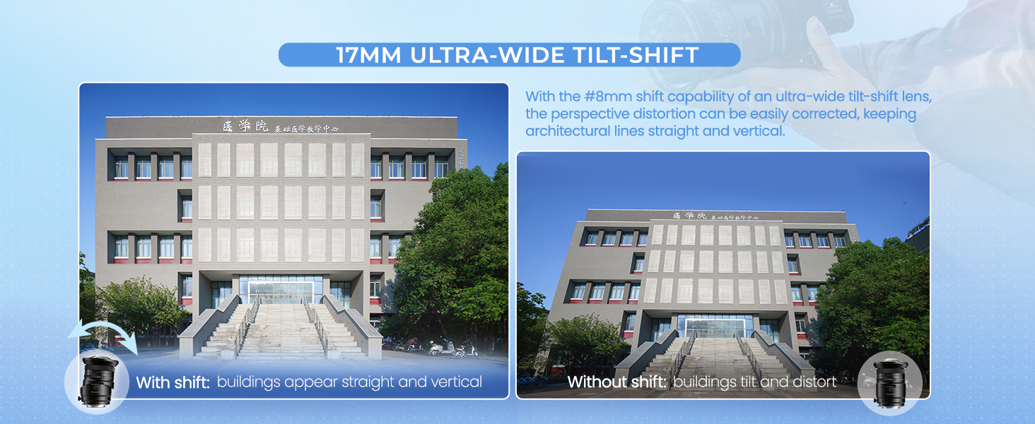 - 17mm Ultra-Wide Tilt-Shift: With the ±8mm shift capability of an ultra-wide tilt-shift lens, the perspective distortion can be easily corrected, keeping architectural lines straight and vertical.