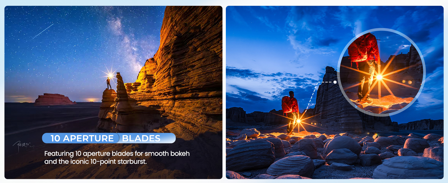 - 10 Point Starburst: Featuring 10 aperture blades for smooth bokeh and the iconic 10-point starburst.