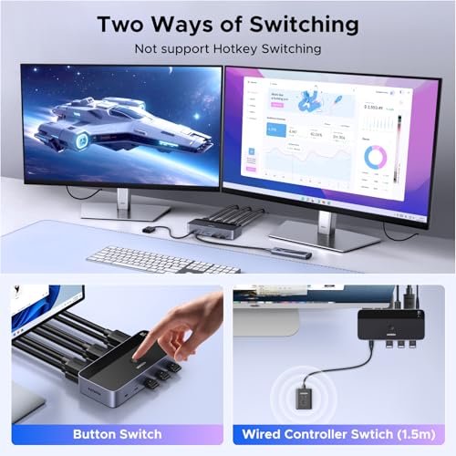 HDMI KVM Switch 2 Monitors 2 Computers: This KVM switch allows you to easily manage and switch between two computers with just one set of keyboard and mouse while simultaneously controlling two monitors and sharing 4 USB 3.0 devices.