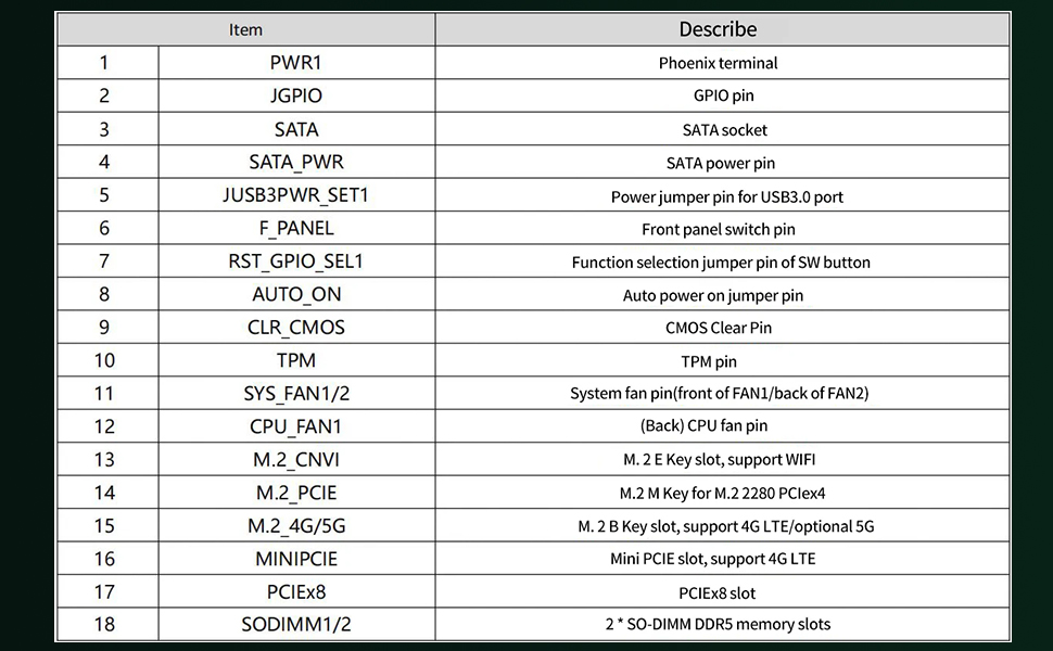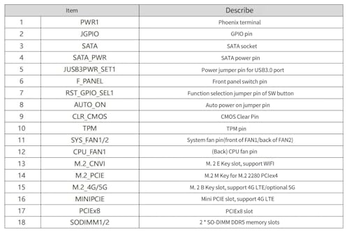 1*PClEx8 expansion slot optional: Intel 82599ES 2*10G SFP+ module or Intel X710-DA4 4*10G SFP+ module or Intel I350-AM4 4*1G SFP module.2xDDR5 SODIMM non-ecc laptop ram slot, support max 96GB 4800/5600MHz. Support 2xM.2 NVME/PCIEx4 2280 SSD+1xSATA3.0.