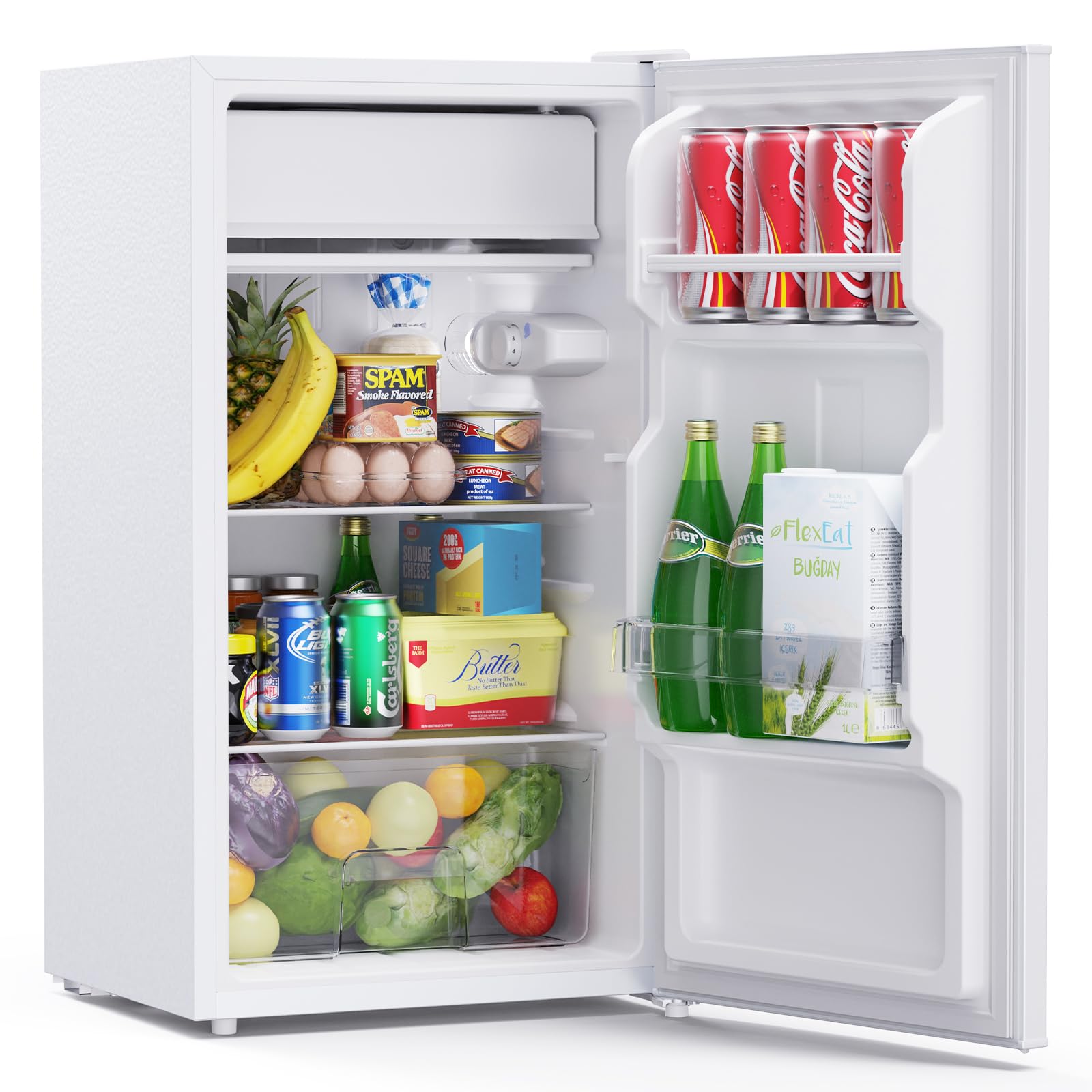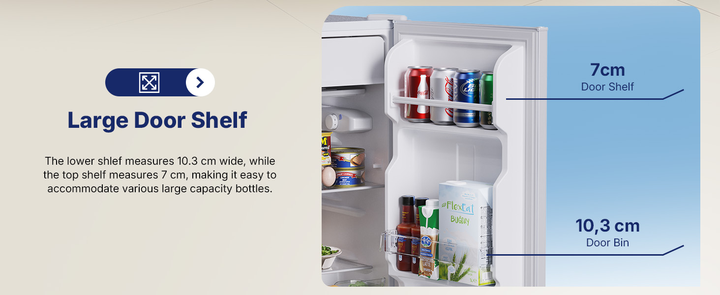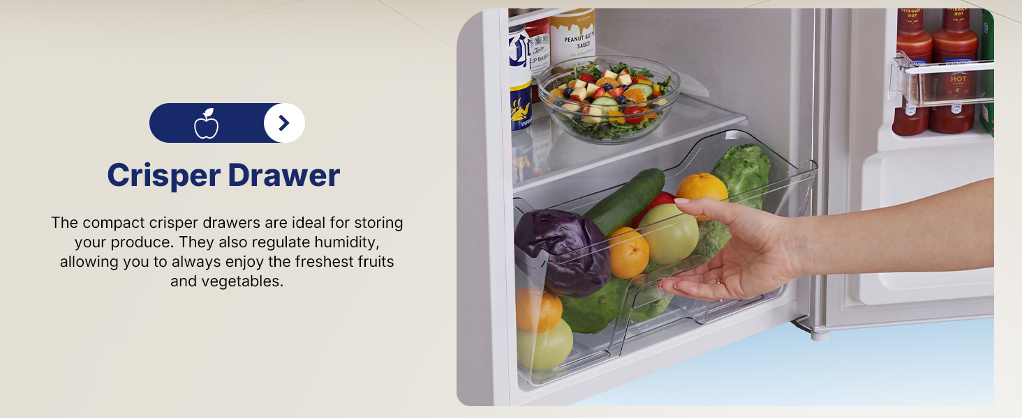 Spacious Storage: The door features 2 door racks that easily hold bottles of different sizes, while a removable glass shelf and a dedicated crisper drawer let you organize fruits, vegetables, and snacks neatly. It’s the perfect balance of small footprint and big storage capacity.