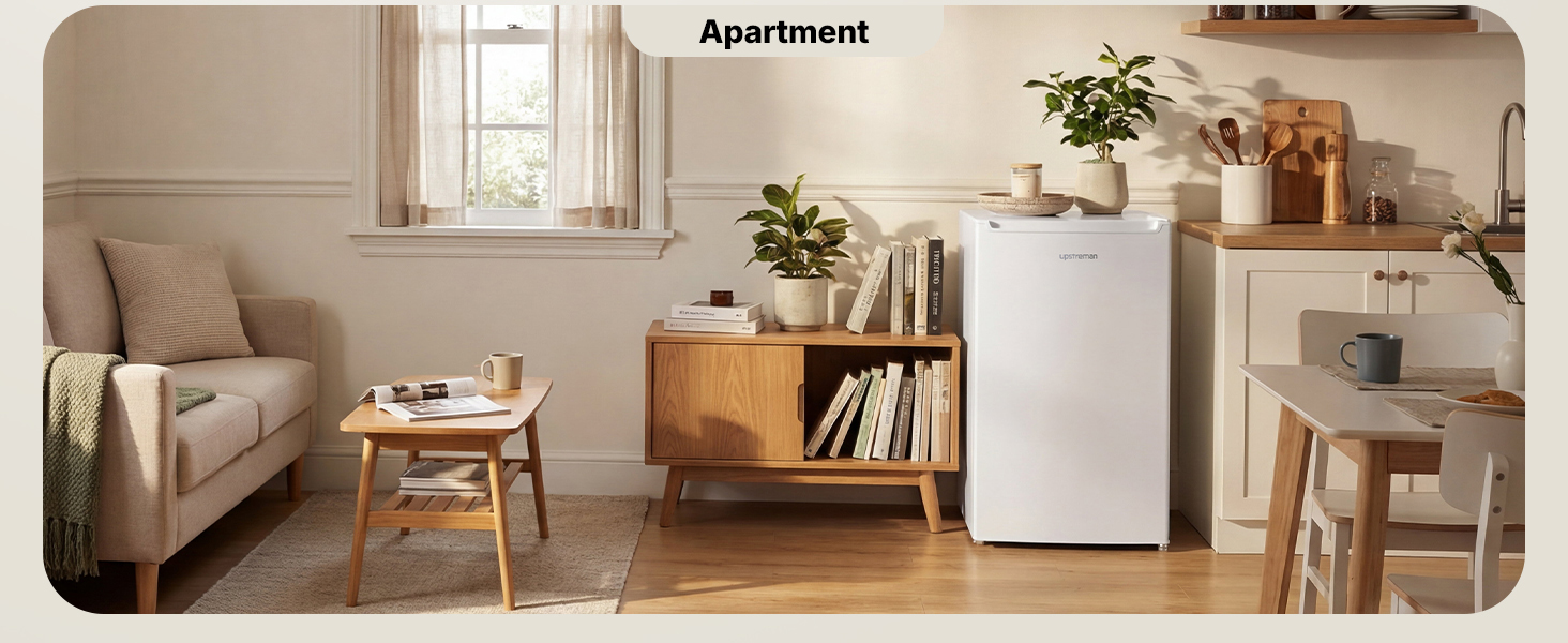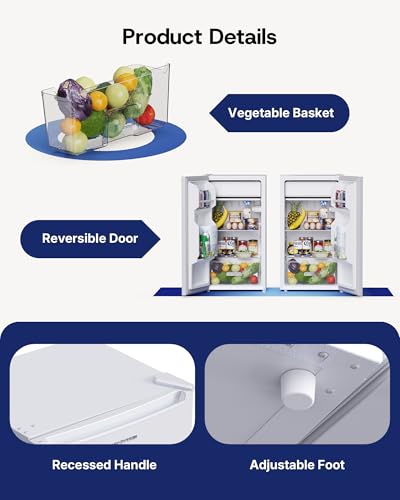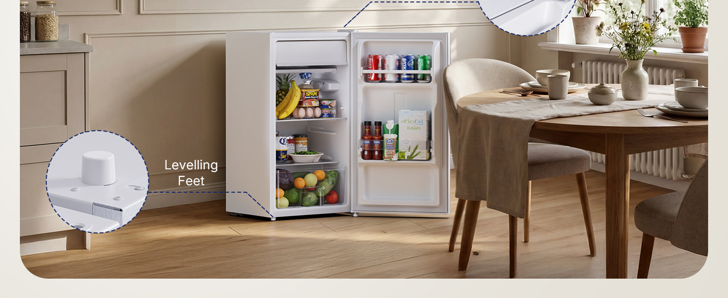 Flexible Design: Built for adaptability, this undercounter fridge comes with a hidden handle and reversible door hinge, allowing you to install the door to open left or right to match your space and habits. It also includes adjustable balance feet that keep the fridge stable on uneven surfaces, ensuring it fits seamlessly into any kitchen layout, dorm room, or compact living area.