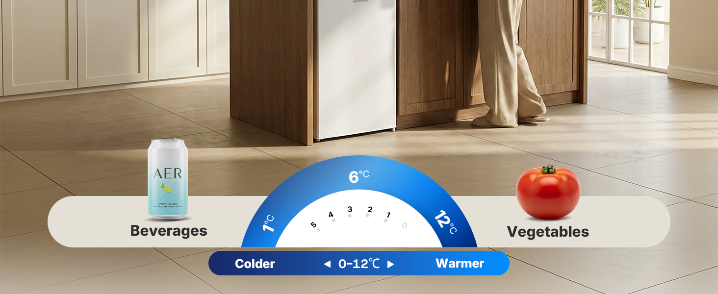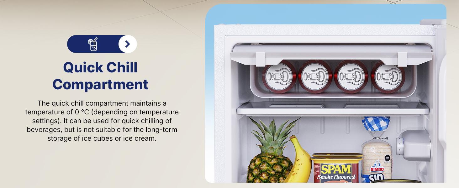 5 Level Temperature Control & Quick Chill Zone: Featuring a 5 level adjustable thermostat, this fridge offers a temperature range of 0-12℃, letting you customize storage conditions for fruits, veggies, dairy, and more. It also includes a dedicated quick chill zone that cools beverages down to around 0℃ (subject to thermostat settings), perfect for quenching your thirst fast—note that this zone is for rapid cooling only and NOT suitable for storing ice or ice cream.