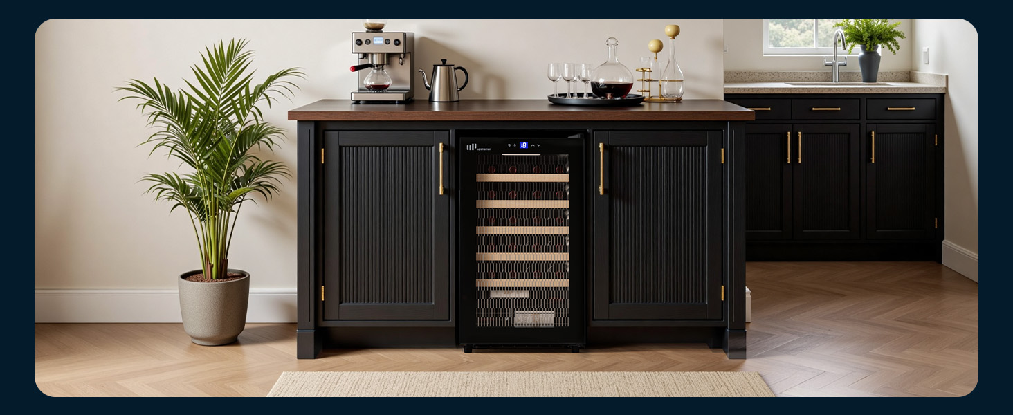 Sleek & Modern Aesthetic: Soft, integrated LED lighting illuminates your wine collection and creates a welcoming ambience. A subtle, hidden handle accentuates the clean, contemporary design, ensuring the cooler blends seamlessly with your existing decor