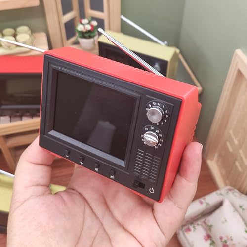 USB Rechargeable Vintage Mini TV Toy 1:12 Scale with LCD Screen, 180° Rotatable Antenna, Plays Video Dollhouse Furniture DIY Accessories Red Retro TV